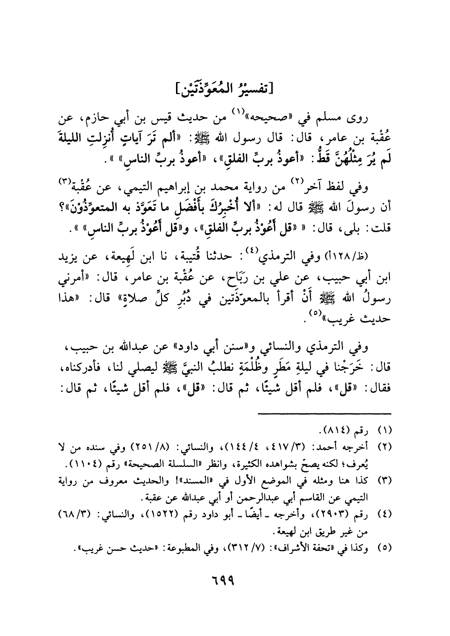 روى مسلم في "صحيحه" (¬١) من حديث قيس بن أبي حازم، عن عُقْبة بن عامر، قال: قال رسول الله - صلى الله عليه وسلم -: "ألم تَرَ آيات أنزِلتِ الليلةَ لَم يُرَ مِثلُهُنَّ قَطُّ: {أَعُوذُ بِرَبِّ الْفَلَقِ}، {أَعُوذُ بِرَبِّ النَّاسِ} "".