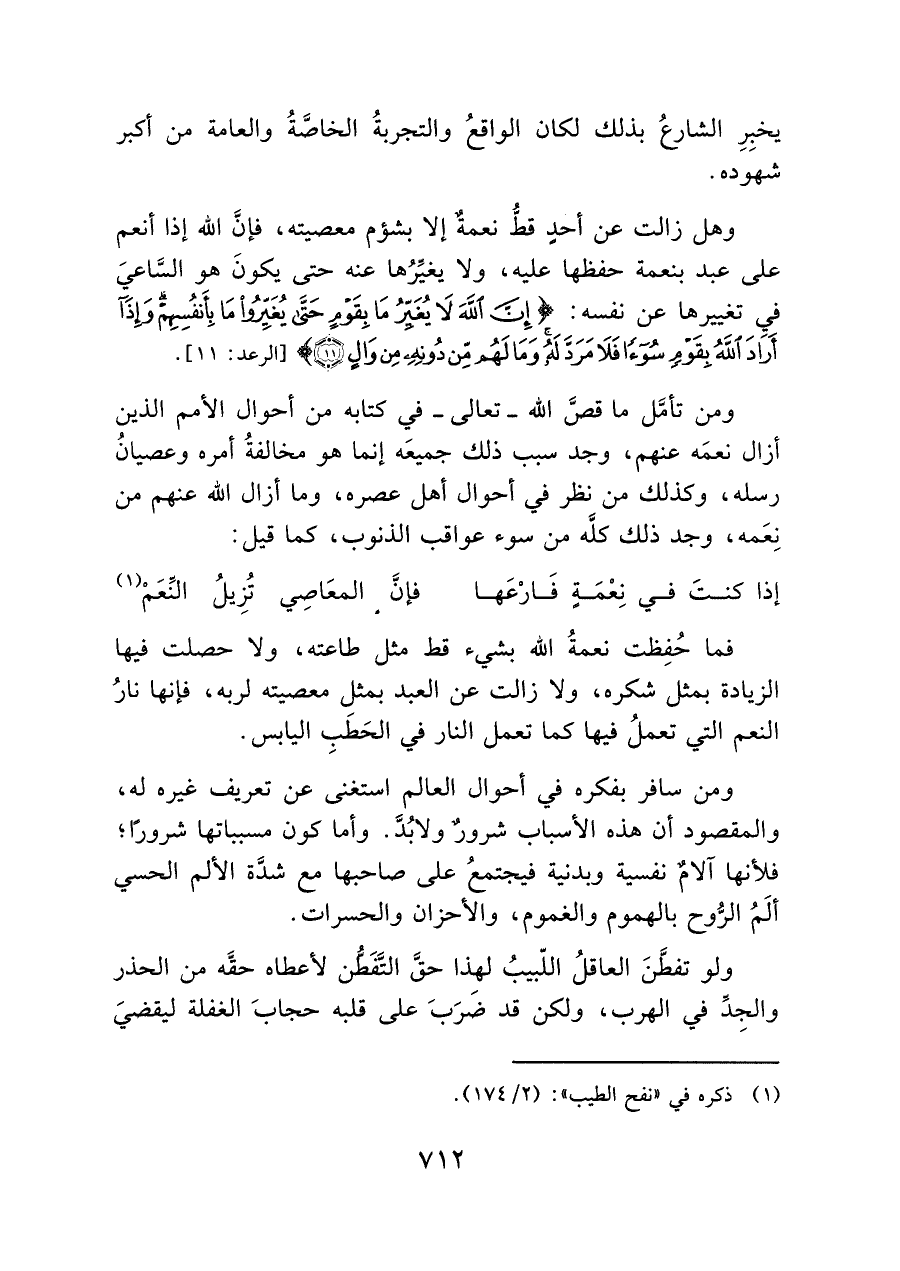 ومن تأمَّل ما قصَّ الله -تعالى- في كتابه من أحوال الأمم الذين أزال نعمَه عنهم, وجد سبب ذلك جميعَه إنما هو مخالفةُ أمره وعصيانُ رسله, وكذلك من نظر في أحوال أهل عصره, وما أزال الله عنهم من نعمه, وجد ذلك كلَّه من سوء عواقب الذنوب كما قيل: