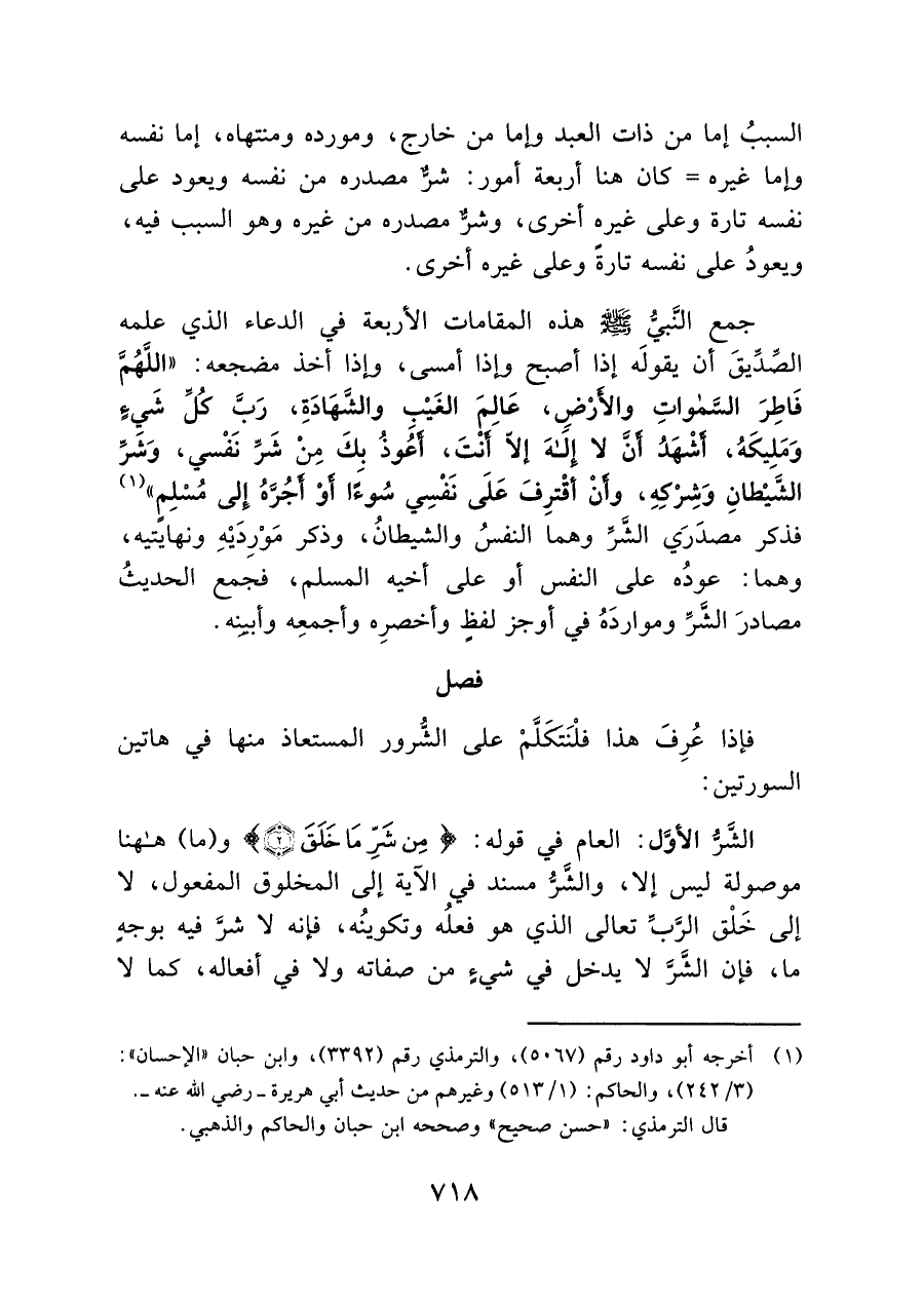 جمع النَّبيّ - صلى الله عليه وسلم - هذه المقامات الأربعة في الدعاء الذي علمه الصِّدِّيقَ أن يقولَه إذا أصبح وإذا أمسى، وإذا أخذ مضجعه: "اللَّهُمَّ فَاطِرَ السَّمواتِ والأَرْضِ، عَالِمَ الغَيْب والشَّهَادَةِ، رَبَّ كُلِّ شَيءٍ ومَلِيكَهُ، أَشْهَدُ أَنَّ لا إِلَهَ إلاّ أَنْتَ، أَعُوذُ بكَ مِن شَرِّ نَفْسي، وَشَرِّ الشَّيْطانِ وَشِرْكِهِ، وأَنْ أقْترِفَ عَلَى نَفْسِي سُوءًا أَوْ أَجُرَّهُ إِلى مُسْلِمٍ" (¬١) فذكر مصدَرَي الشَّرِّ وهما النفسُ والشيطانُ، وذكر مَوْرِدَيْهِ ونهايتيه، وهما: عودُه على النفس أو على أخيه المسلم، فجمع الحديثُ مصادرَ الشَّرِّ ومواردَهُ في أوجز لفظٍ وأخصرِه وأجمعِه وأبينِه.