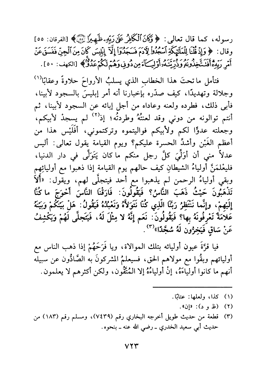 فتأمل ما تحتَ هذا الخطابِ الذي يسلبُ الأرواحَ حلاوةً وعقابًا (¬١) وجلالة وتهديدًا، كيف صدّره بإخبارنا أنه أمر إبليسَ بالسجود لأبينا، فأبى ذلك، فطرده ولعنه وعاداه من أجل إبائه عن السجود لأبينا، ثم أنتم توالونه من دوني وقد لعنتُه وطردتُه؛ إذ (¬٢) لم يسجدْ لأبيكم، وجعلته عدوًّا لكم ولأبيكم فواليتموه وتركتموني، أفَلَيْس هذا من أعظم الغَبْن وأشدِّ الحسرة عليكم؟ ويوم القيامة يقول تعالى: أليس عدلاً مني أن أوَلِّيَ كلَّ رجل منكم ما كان يَتَوَلَّى في دار الدنيا، فليعْلمَنَّ أولياءُ الشيطان كيف حالهم يوم القيامة إذا ذهبوا مع أوليائِهم وبقي أولياءُ الرحمن لم يذهبوا مع أحد فيتجلَّى لهم، ويقول: "أَلا تَذْهَبُونَ حَيْثُ ذَهَبَ النَّاسُ؛ فَيَقُولونَ: فَارَقْنَا النَّاسَ أَحْوَجَ ما كُنَّا إِلَيْهِمْ، وإِنَّما نَنْتَظِرُ رَبَّنَا الّذِي كُنّا نَتَوَلَاّهُ وَنَعْبُدُهُ فَيَقُولُ: هَلْ بَيْنَكُمْ وَبَيْنَهُ عَلامَةٌ تَعْرِفُونَهُ بِها؟ فَيَقُولُونَ: نَعَم إِنَّهُ لا مِثْلَ لَهُ، فَيَتَجلَّى لَهُمْ وَيَكْشِفُ عَنْ سَاقٍ فَيَخِرُّون لَهُ سُجَّدًا" (¬٣).