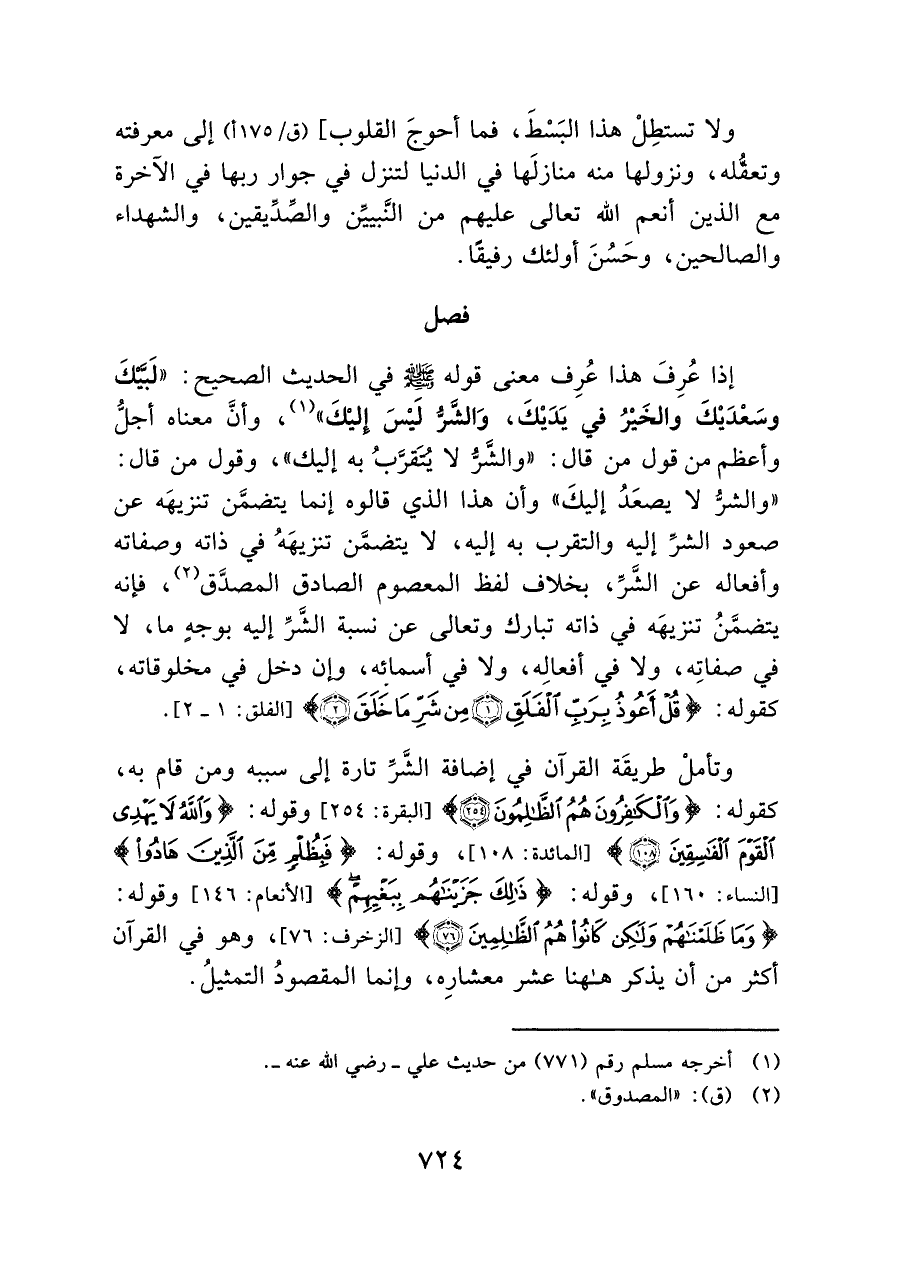إذا عُرِفَ هذا عُرِف معنى قوله - صلى الله عليه وسلم - في الحديث الصحيح: "لَبَّيْكَ وسَعْدَيْكَ والخَيْرُ في يدَيْكَ، وَالشَّرُّ لَيْسَ إِليْكَ" (¬١)، وأنَّ معناه أجلُّ وأعظم من قول من قال: "والشَرُّ لا يُتَقرَّبُ به إليك"، وقول من قال: "والشرُّ لا يصعَدُ إليكَ" وأن هذا الذي قالوه إنما يتضمَّن تنزيهَه: عن صعود الشرِّ إليه والتقرب به إليه، لا يتضمَّن تنزيهَهُ في ذاته وصفاته وأفعاله عن الشَّرِّ، بخلاف لفظ المعصوم الصادق المصدَّق (¬٢)، فإنه يتضمَّنُ تنزيهَه في ذاته تبارك وتعالى عن نسبة الشَّرِّ إليه بوجهٍ ما، لا في صفاتِه، ولا في أفعالِه، ولا في أسمائه، وإن دخل في مخلوقاته، كقوله: {قُلْ أَعُوذُ بِرَبِّ الْفَلَقِ (١) مِنْ شَرِّ مَا خَلَقَ (٢)} [الفلق: ١ - ٢].