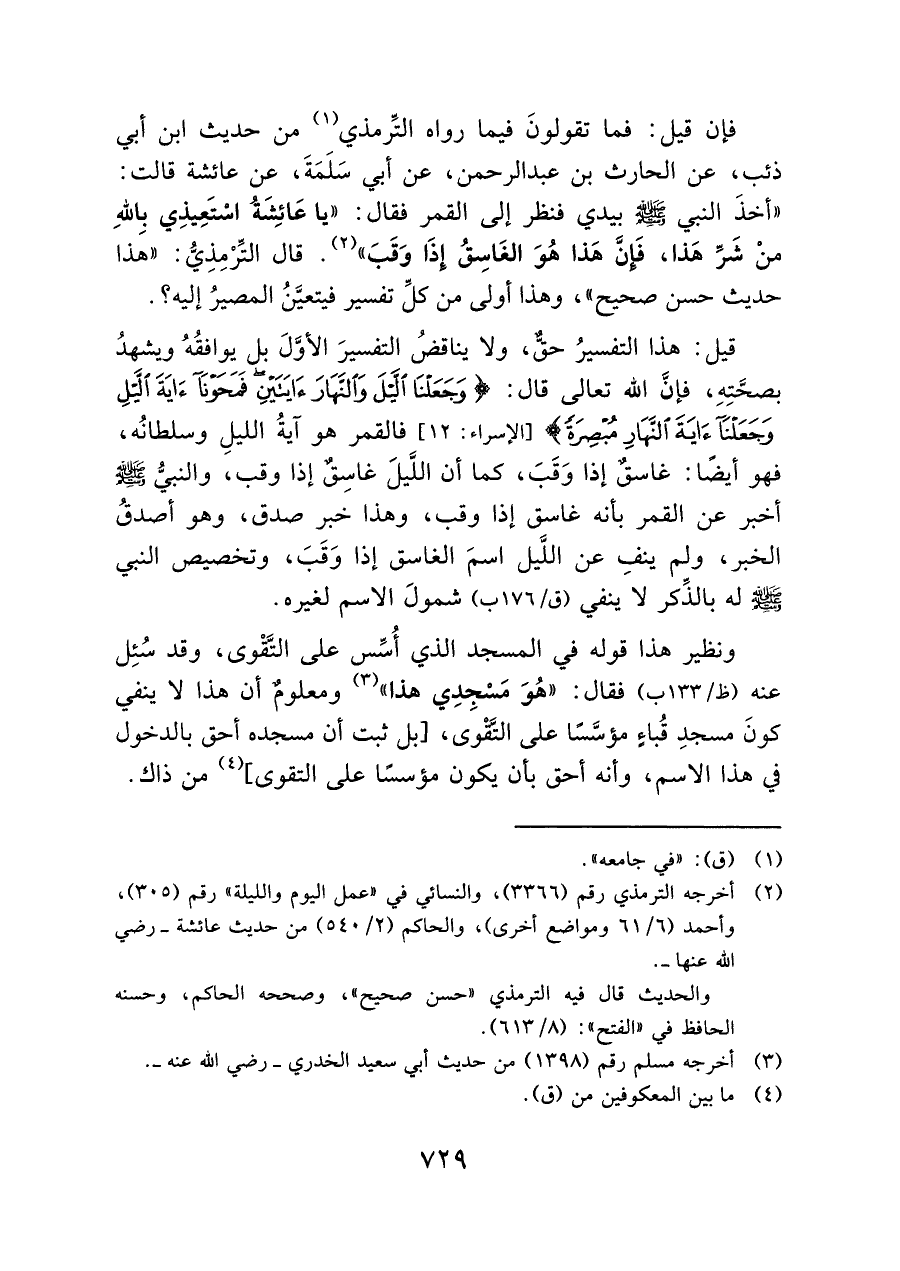 فإن قيل: فما تقولونَ فيما رواه التِّرمذي (¬١) من حديث ابن أبي ذئب، عن الحارث بن عبد الرحمن، عن أبي سَلَمَةَ، عن عائشة قالت: "أخذَ النبي - صلى الله عليه وسلم - بيدي فنظر إلى القمر فقال: "يا عَائِشَةُ اسْتَعِيذِي باللهِ منْ شَرِّ هَذا، فَإِنَّ هَذا هُوَ الغَاسِقُ إِذَا وَقَبَ" (¬٢). قال التِّرْمِذِيُّ: "هَذا حديث حسن صحيح"، وهذا أولى من كلِّ تفسير فيتعيَّنُ المصرُ إليه؟.