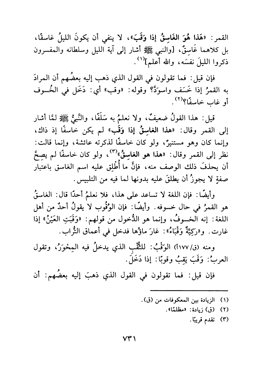 قيل: هذا القولُ ضعيفٌ، ولا نعلمُ به سَلَفًا، والنَّبيُّ - صلى الله عليه وسلم - لمَّا أشار إلى القمر وقال: "هذا الغاسِقُ إذا وَقَب" لم يكن خاسفًا إذ ذاك، وإنما كان وهو مستنيرٌ، ولو كان خاسفًا لذكرته عائشة، وإنما قالت: نظر إلى القمر وقال: "هذا هو الغاسِقُ " (¬٣)، ولو كان خاسفًا لم يصِحَّ أن يحذفَ ذلك الوصف منه، فإنَّ ما أُطْلِق عليه اسم الغاسق باعتبار صفةٍ لا يجوزُ أن يطلقَ عليه بدونها لما فيه من التلبيس.