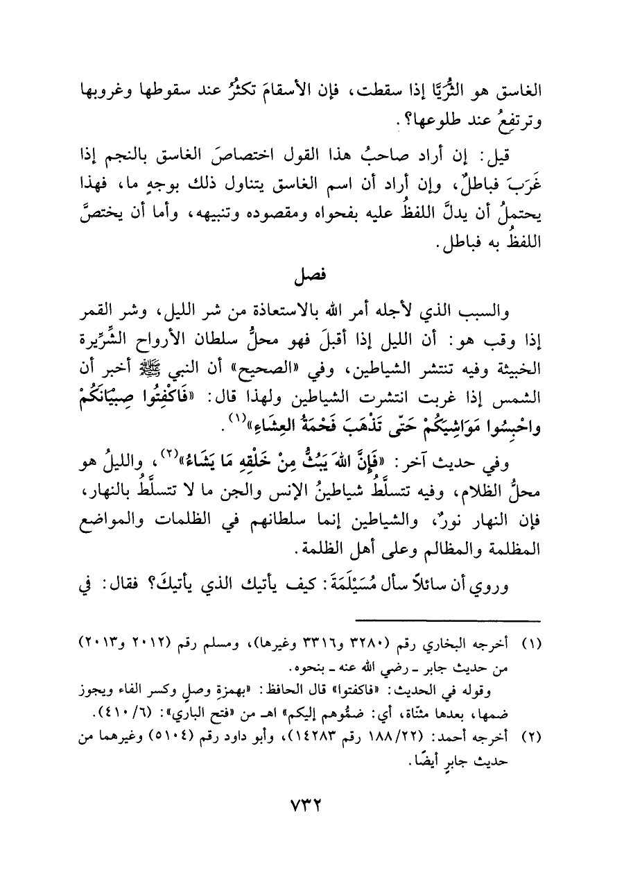 والسبب الذي لأجله أمر الله بالاستعاذة من شر الليل، وشر القمر إذا وقب هو: أن الليل إذا أقبلَ فهو محلُّ سلطان الأرواح الشِّرِّيرة الخبيثة وفيه تنتشر الشياطين، وفى "الصحيح" أن النبي - صلى الله عليه وسلم - أخبر أن الشمس إذا غربت انتشرت الشياطين ولهذا قال: "فَاكْفِتُوا صِبْيَانَكُمْ واحْبِسُوا مَوَاشِيَكُمْ حَتّى تَذْهَب فَحْمَةُ العِشَاءِ" (¬١).