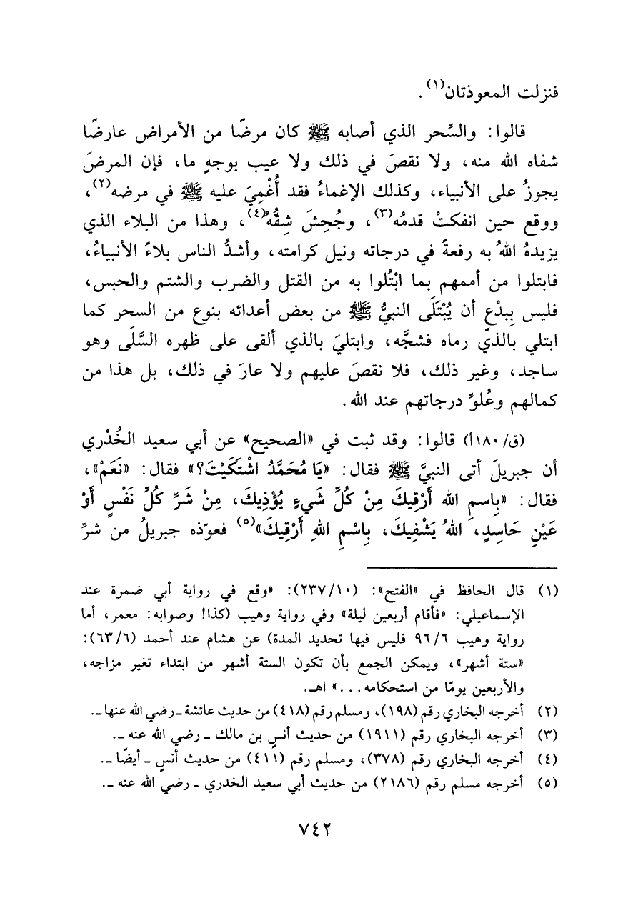 قالوا: والسِّحر الذي أصابه - صلى الله عليه وسلم - كان مرضًا من الأمراض عارضًا شفاه الله منه, ولا نقصَ في ذلك ولا عيب بوجهٍ ما, فإن المرضَ يجوزُ على الأنبياء, وكذلك الإغماءُ فقد أُغْمِيَ عليه - صلى الله عليه وسلم - في مرضه (¬٢) , ووقع حين انفكتْ قدمُه (¬٣) , وجُحِشَ شِقُّهُ (¬٤) , وهذا من البلاء الذي يزيدهُ اللهُ به رفعةً في درجاته ونيل كرامته, وأشدُّ الناس بلاءً الأنبياءُ, فابتلوا من أممهم بما ابْتُلوا به من القتل والضرب والشتم والحبس, فليس بِبدْعٍ أن يُبْتَلَى النبيُّ - صلى الله عليه وسلم - من بعض أعدائه بنوع من السحر كما ابتلى بالذي رماه فشجَّه, وابتليَ بالذي ألقى على ظهره السَّلَى وهو ساجد, وغير ذلك, فلا نقصَ عليهم ولا عارَ في ذلك, بل هذا من كمالهم وعُلوٌّ درجاتهم عند الله.
