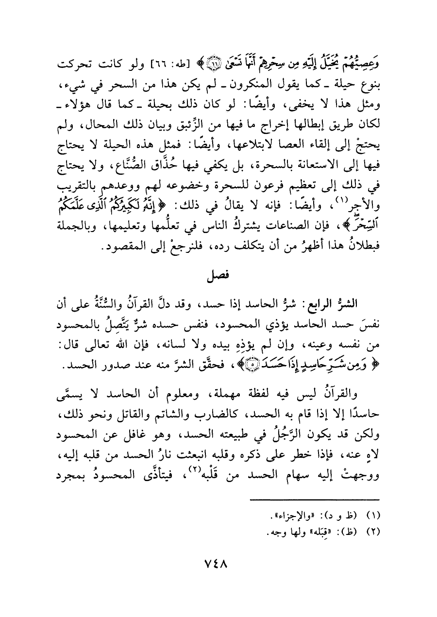 وَعِصِيُّهُمْ يُخَيَّلُ إِلَيْهِ مِنْ سِحْرِهِمْ أَنَّهَا تَسْعَى (٦٦)} [طه: ٦٦] ولو كانت تحركت بنوع حيلة -كما يقوله المنكرون- لم يكن هذا من السحر في شيء, ومثل هذا لا يخفى, وأيضًا: لو كان ذلك بحيلة -كما قال هؤلاء- لكان طريق إبطالها إخراج ما فيها من الزِّئبق وبيان ذلك المحال, ولم يحتجْ إلى إلقاء العصا لابتلاعها, وأيضًا: فمثل هذه الحيلة لا يحتاج فيها إلى الاستعانة بالسحرة, بل يكفي فيها حُذَّاق الصُّنَّاع, ولا يحتاج في ذلك إلى تعظيم فرعون للسحرة وخضوعه لهم ووعدهم بالتقريب والأجر (¬١) , وأيضًا: فإنه لا يقالُ في ذلك: {إِنَّهُ لَكَبِيرُكُمُ الَّذِي عَلَّمَكُمُ السِّحْرَ} , فإن الصناعات يشتركُ الناس في تعلُّمها وتعليمها, وبالجملة فبطلانُ هذا أظهرُ من أن يتكلف رده فلنرجعْ إلى المقصود.