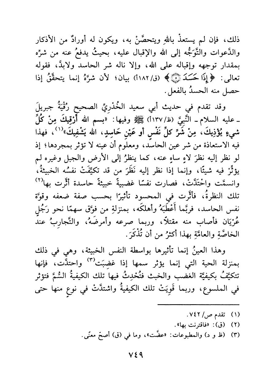 وقد تقدم في حديث أبي سعيد الخُدْرِيِّ الصحيح رُقْيَةُ جبريلَ - عليه السلام - النَّبِيَّ - صلى الله عليه وسلم - وفيها: "بسم الله أَرْقِيكَ مِنْ كُلِّ شيءٍ يُؤْذِيكَ, مِنْ شَرِّ كلِّ نَفْسٍ أو عَيْنِ حَاسِدٍ, الله يَشْفِيكَ" (¬١) , فهذا فيه الاستعاذة من شر عين الحاسد, ومعلوم أن عينه لا تؤثر بمجردها؛ إذ لو نظر إليه نظرَ لاهٍ ساهٍ عنه, كما ينظرُ إلى الأرض والجبل وغيره لم يؤثِّرْ فيه شيئًا؛ وإنما إذا نظر إليه نَظَرَ من قد تكيَّفَتْ نفسُه الخبيثةُ, واتسمَّت واحْتَدَّتْ, فصارت نفسًا غضبيةً خبيثةً حاسدة أثَّرت بها (¬٢) تلك النظرةُ, فأثَّرت في المحسود تأثيرًا بحسب صفة ضعفه وقوَّة نفس الحاسد, فربَّما أَعْطَبَهُ وأهلكَه, بمنزلةِ من فوَّق سهمًا نحو رَجُلٍ عُرْيَان فأصاب منه مقتلًا, وربما صرعه وأمرضَهُ, والتَّجارِبُ عند الخاصَّةِ والعامَّةِ بهذا أكثرُ من أن تُذْكَرَ.
