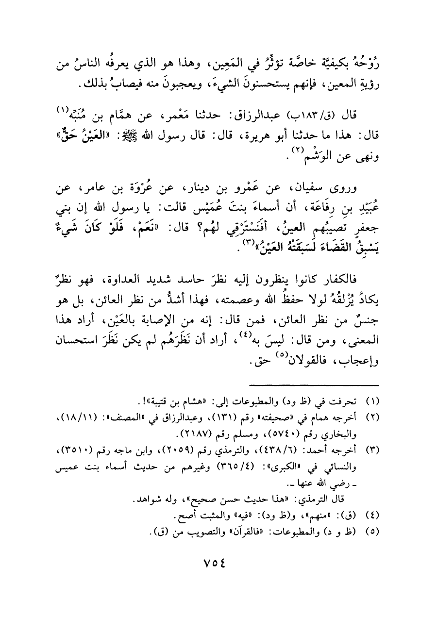 قال عبد الرزاق: بن مَعْمر, عن همَّام بن مُنَبِّه (¬١) قال: هذا ما حدثنا أبو هريرة, قال قال رسول الله - صلى الله عليه وسلم -: "العَيْنُ حَقٌّ" ونهى عن الوَشْم (¬٢).