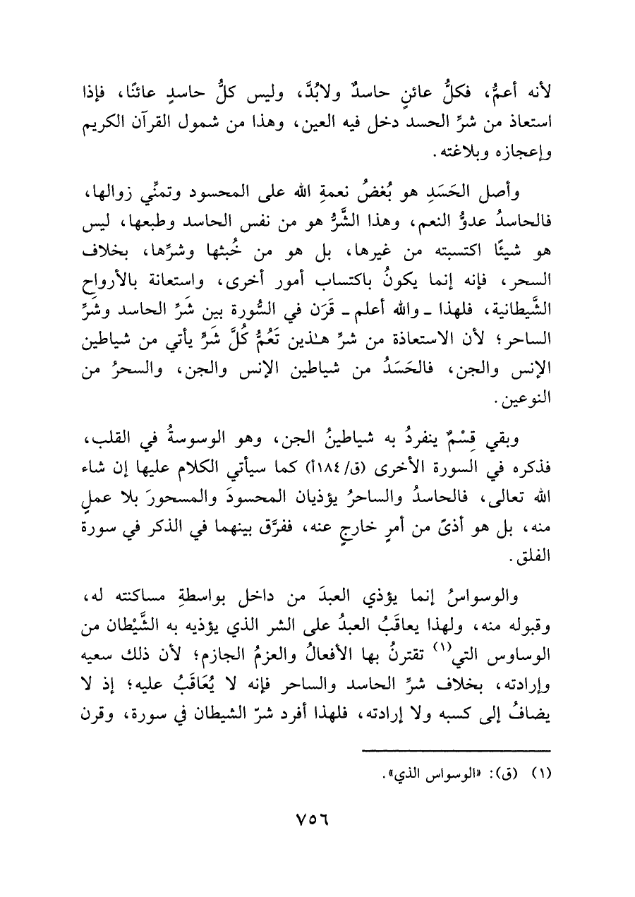 وبقي قِسْمٌ ينفردُ به شياطينُ الجن, وهو الوسوسةُ في القلب, فذكره في السورة الأخرى كما سيأتي الكلام عليها إن شاء الله تعالى, فالحاسدُ والساحرُ يؤذيان المحسودَ والمسحورَ بلا عملٍ منه, بل هو أذىً من أمرٍ خارجٍ عنه, ففرَّق بينهما في الذكر في سورة الفلق.