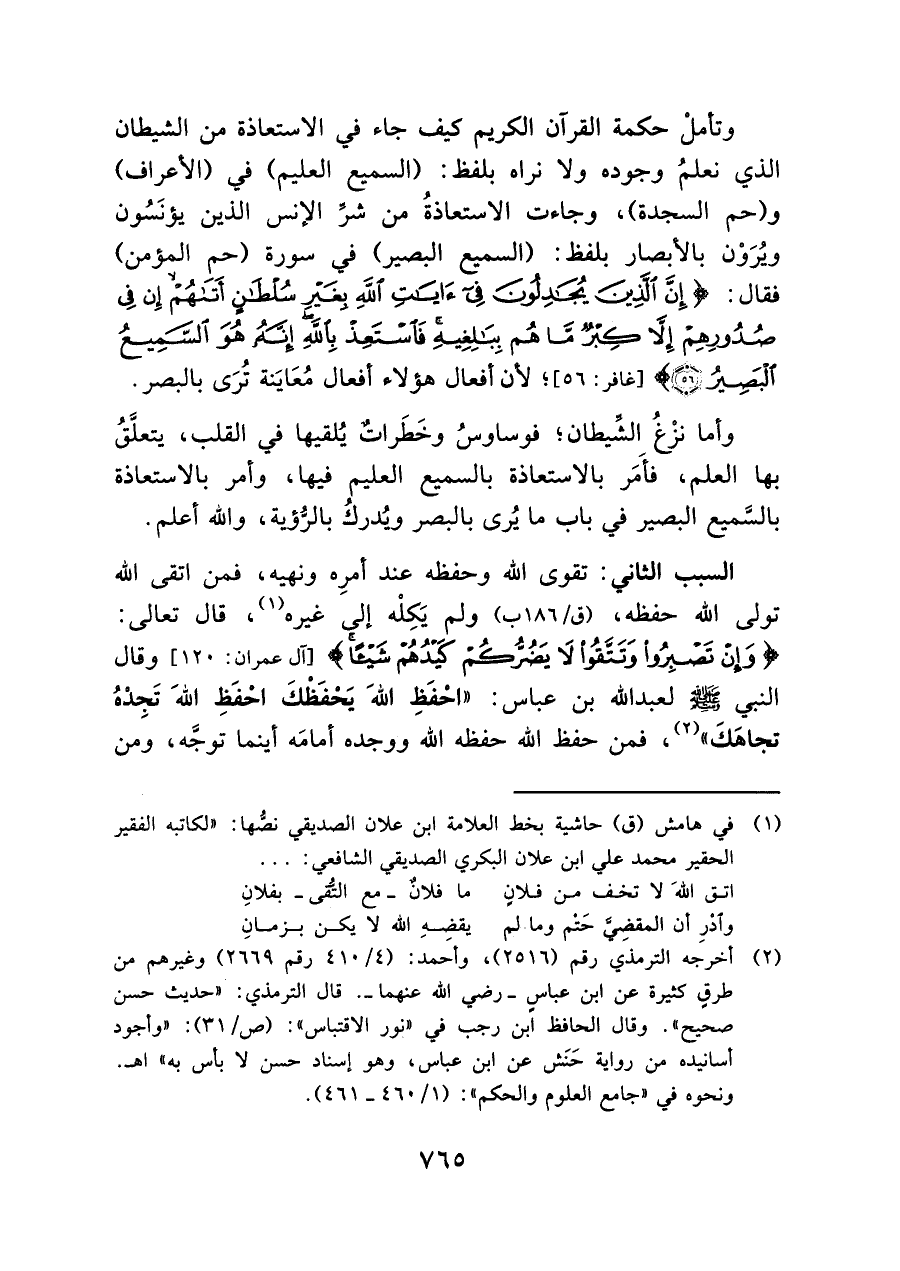 (¬١) في هامش (ق) حاشية بخط العلامة ابن علان الصديقي نصُّها: "لكاتبه الفقير الحقير محمد على ابن علان البكري الصديقي الشافعي: ... اتق اللهَ لا تخف من فلانٍ ... ما فلانٌ -مع التُّقى- بفلانِ وأدْرِ أن المقضِيَّ حَتْم وما لم ... يقضِهِ الله لا يكن بزمانِ