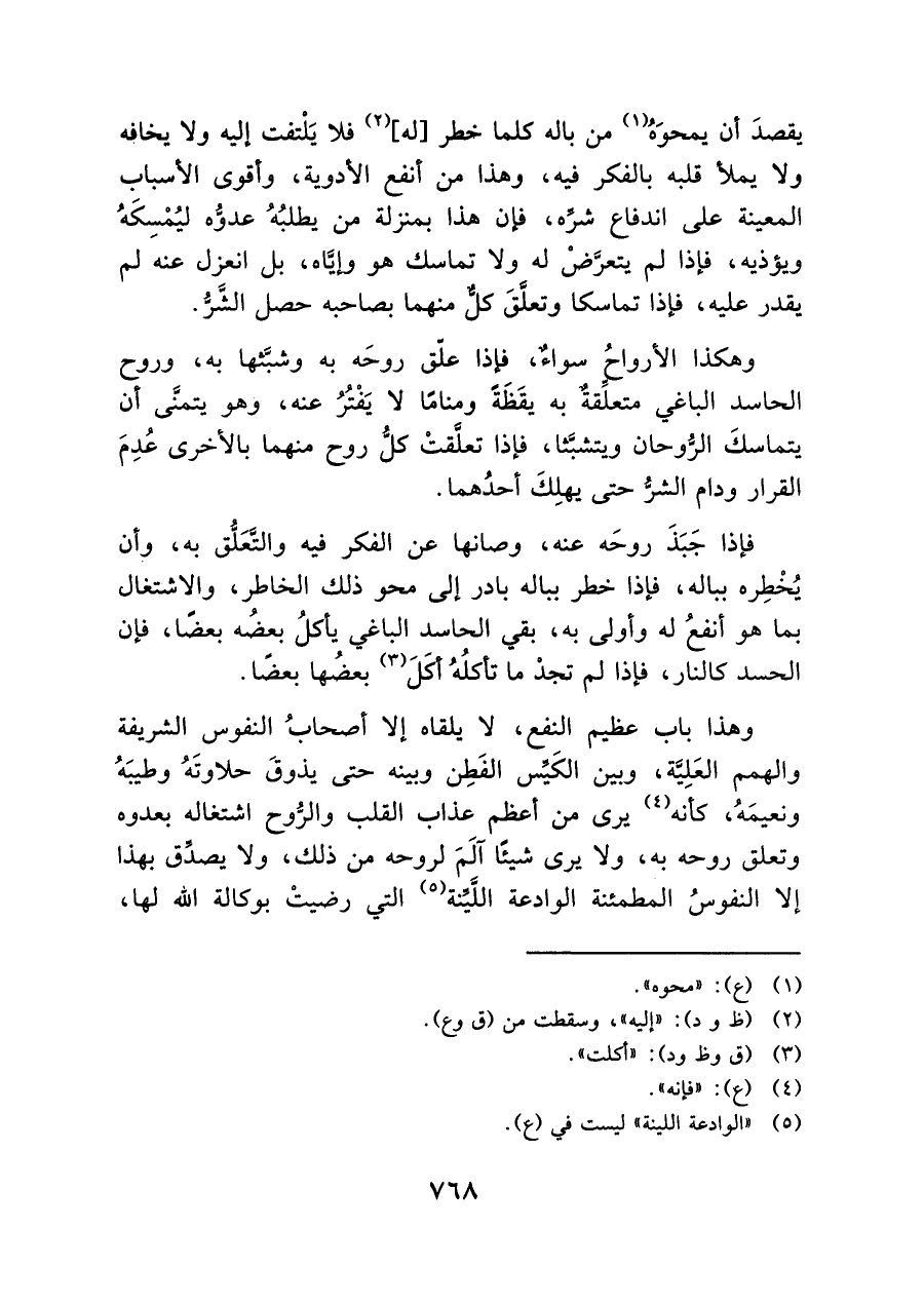 وهكذا الأرواحُ سواءٌ، فإذا علّق روحَه به وشبَّثها به، وروح الحاسد الباغي متعلِّقةٌ به يقَظَةً ومنامًا لا يَفتُرُ عنه، وهو: يتمنَّى أن يتماسكَ الرُّوحان ويتشبَّثا، فإذا تعلَّقتْ كلُّ روح منهما بالأخرى عُدِمَ القرار ودام الشرُّ حتى: يهلِكَ أحدُهما.