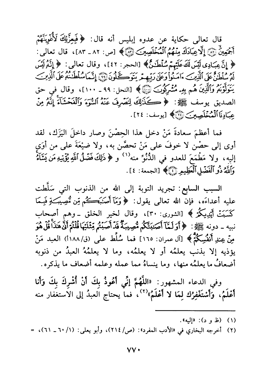 قال تعالى حكاية عن عدوه إبليس أنه قال: {قَالَ فَبِعِزَّتِكَ لَأُغْوِيَنَّهُمْ أَجْمَعِينَ (٨٢) إِلَّا عِبَادَكَ مِنْهُمُ الْمُخْلَصِينَ (٨٣)} [ص: ٨٢ - ٨٣] قال تعالى: {إِنَّ عِبَادِي لَيْسَ لَكَ عَلَيْهِمْ سُلْطَانٌ} [الحجر: ٤٢]، وقال تعالى: {إِنَّهُ لَيْسَ لَهُ سُلْطَانٌ عَلَى الَّذِينَ آمَنُوا وَعَلَى رَبِّهِمْ يَتَوَكَّلُونَ (٩٩) إِنَّمَا سُلْطَانُهُ عَلَى الَّذِينَ يَتَوَلَّوْنَهُ وَالَّذِينَ هُمْ بِهِ مُشْرِكُونَ (١٠٠)} [النحل: ٩٩ - ١٠٠]، وقال في حق الصديق يوسف - صلى الله عليه وسلم -: {كَذَلِكَ لِنَصْرِفَ عَنْهُ السُّوءَ وَالْفَحْشَاءَ إِنَّهُ مِنْ عِبَادِنَا الْمُخْلَصِينَ (٢٤)} [يوسف: ٢٤].