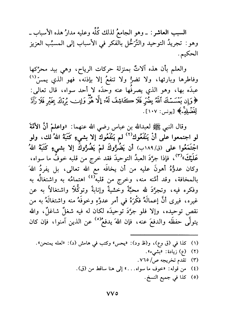 السبب العاشر: -وهو الجامعُ لذلك كُلِّه وعليه مدارُ هذه الأسباب- وهو: تجريدُ التوحيد والتَّرَحُّل بالفكر في الأسباب إلى المسبِّب العزيز الحكيم.