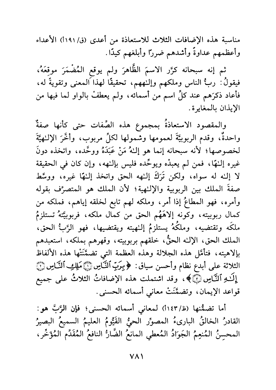 والمقصود الاستعاذةُ بمجموع هذه الصِّفات حتى كأنها صفةٌ واحدةٌ، وقدم الربوبيَّةَ لعمومها وشمولها لكلِّ مربوب، وأخَّرَ الإلهيَّةَ لخصوصها؛ لأنه سبحانه إنما هو إلهُ مَنْ عَبَدَهُ ووحَّده، واتخذه دونَ غيره إلهًا، فمن لم يعبدْه ويوحِّده فليس بإلهه، وإن كان في الحقيقة لا إله له سواه، ولكن تَرَكَ إلهه الحق واتخذ إلهًا غيره، ووسَّط صفةَ الملك بين الربوبية والإلهية؛ لأن الملك هو المتصرِّف بقوله وأمره، فهو المطاعُ إذا أمر، وملكه لهم تابع لخلقه إياهم، فملكه من كمال ربوبيته، وكونه إلاهَهُم الحق من كمال ملكه، فى بربوبيَّتهُ تستلزمُ ملكَه وتقتضيه، وملكُهُ يستلزمُ إلهيته ويقتضيها، فهو الرَّبُّ الحق، الملك الحق، الإله الحقُّ، خلقهم بربوبيته، وقهرهم بملكه، استعبدهم بإلاهيته، فتأمَّل هذه الجلالة وهذه العظمة التي تضمَّنَتْها هذه الألفاظ الثلاثة على أبدع نظام وأحسن سياق: {قُلْ أَعُوذُ بِرَبِّ النَّاسِ (١) مَلِكِ النَّاسِ (٢) إِلَهِ النَّاسِ (٣)}، وقد اشتملت هذه الإضافاتُ الثلاثُ على جميع قواعد الإيمان، وتضمَّنَتْ معاني أسمائه الحسنى.