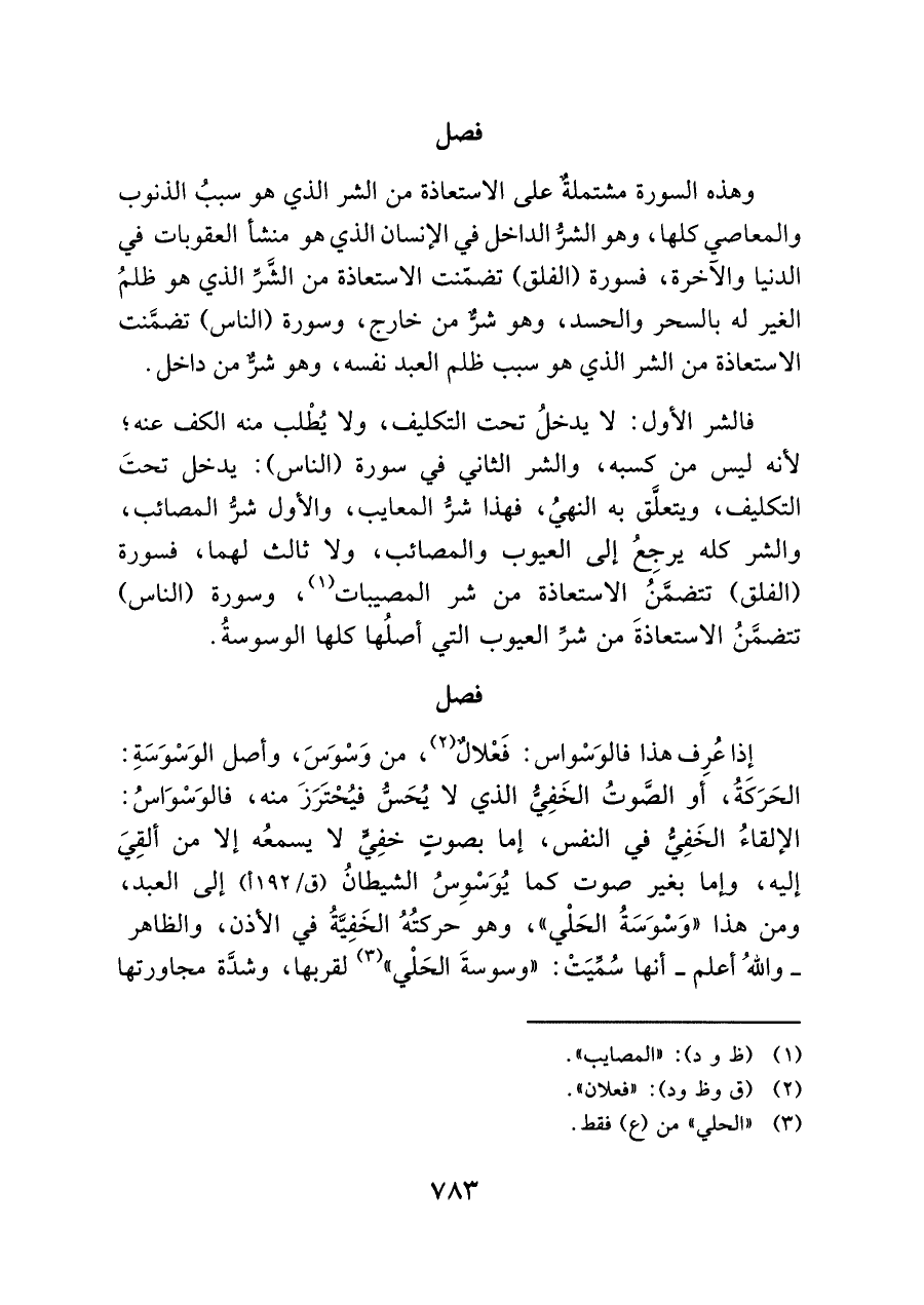 فالشر الأول: لا يدخلُ تحت التكليف، ولا يُطْلب منه الكف عنه؛ لأنه ليس من كسبه، والشر الثاني في سورة (الناس): يدخل تحتَ التكليف، ويتعلَّق به النهيُ، فهذا شرُّ المعايب، والأول شرُّ المصائب، والشر كله يرجعُ إلى العيوب والمصائب، ولا ثالث لهما، فسورة (الفلق) تتضمَّنُ الاستعاذة من شر المصيبات (¬١)، وسورة (الناس) تتضمَّنُ الاستعاذةَ من شرِّ العيوب التي أصلُها كلها الوسوسةُ.