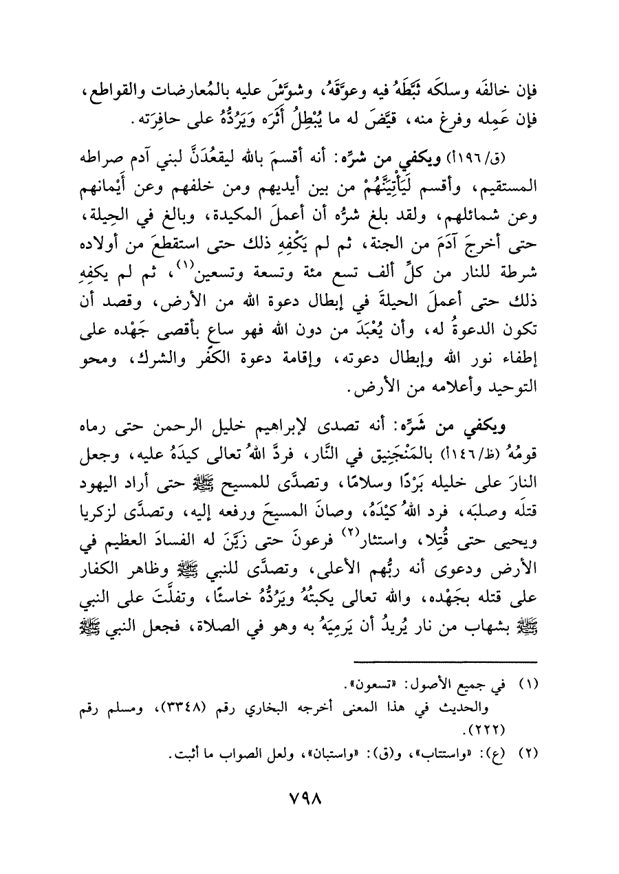 ويكفي من شَرِّه: أنه تصدى لإبراهيم خليل الرحمن حتى رماه قومُهُ بالمَنْجَنِيق فى النَّار، فردَّ اللهُ تعالى كيدَهُ عليه، وجعل النارَ على خليله بَرْدًا وسلامًا، وتصدَّى للمسيح - صلى الله عليه وسلم - حتى أراد اليهود قتلَه وصلبَه، فرد الله كَيْدَهُ، وصان المسيحَ ورفعه إليه، وتصدَّى لزكريا ويحيى حتى قُتِلا، واستثار (¬٢) فرعون حتى زَيَّنَ له الفسادَ العظيم في الأرض ودعوى أنه ربُّهم الأعلى، وتصدَّى للنبي - صلى الله عليه وسلم - وظاهر الكفار على قتلة بجَهْده، والله تعالى يكبتُهُ ويَرُدُّهُ خاسئًا، وتفلَّتَ على النبي - صلى الله عليه وسلم - بشهاب من نار يُريد أن يَرمِيَهُ به وهو فى الصلاة، فجعل النبي - صلى الله عليه وسلم -