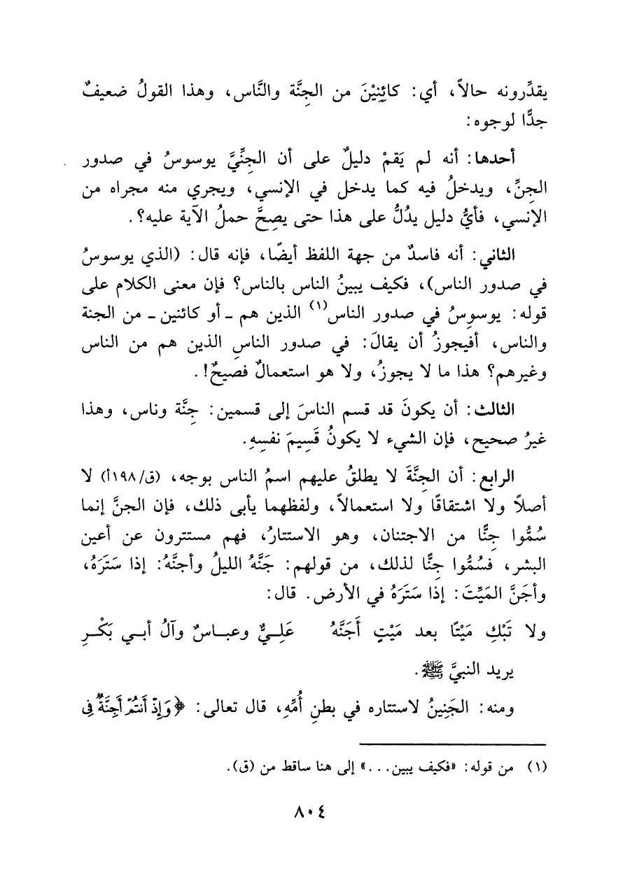 الثالث: أن يكونَ قد قسم الناسَ إلى قسمين: جِنَّة وناس، وهذا غيرُ صحيح، فإن الشيء لا يكون قَسِيمَ نفسِهِ.