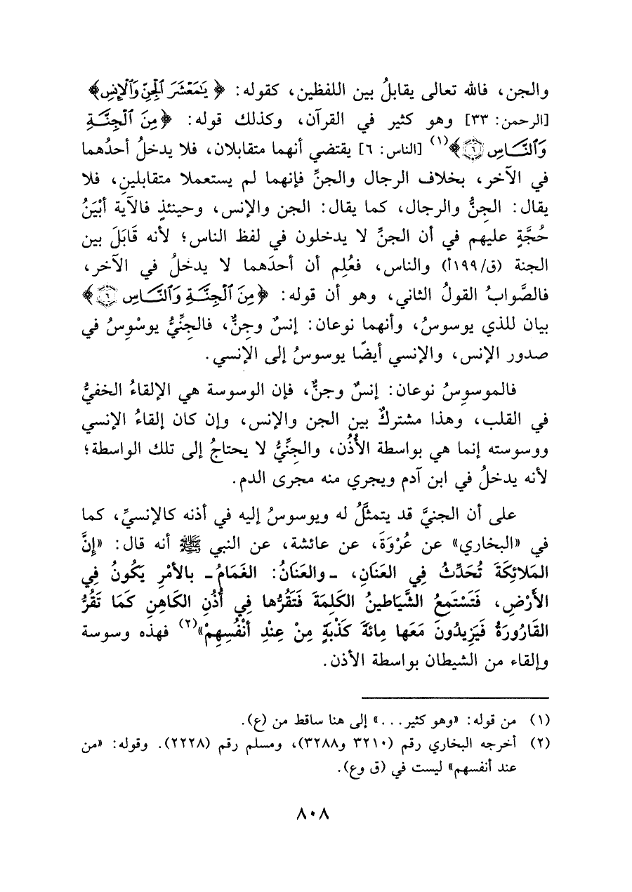 والجن، فالله تعالى يقابلُ بين اللفظين، كقوله: {يَامَعْشَرَ الْجِنِّ وَالْإِنْسِ} [الرحمن: ٣٣] وهو كثير في القرآن، وكذلك قوله: {مِنَ الْجِنَّةِ وَالنَّاسِ (٦)} (¬١) [الناس: ٦] يقتضي أنهما متقابلان، فلا يدخلُ أحدُهما في الآخر، بخلاف الرجال والجنِّ فإنهما لم يستعملا متقابلينِ، فلا: يقال: الجنُّ والرجال، كما يقال: الجن والإنس، وحينئذٍ فالآية أبْيَنُ حُجَّةٍ عليهَم في أن الجنِّ لا يدخلون في لفظ الناس؛ لأنه قَابَلَ بين الجنة والناس، فعُلِم أن أحدَهما لا يدخلُ فِي الآخر، فالصَّواب القولُ الثاني، وهو أن قوله: {مِنَ الْجِنَّةِ وَالنَّاسِ (٦)} بيان للذي يوسوسُ، وأنهما نوعان: إنسٌ وجنٌّ، فالجِنِّيُّ يوسْوِسُ في صدور الإنس، والإنسي أيضًا يوسوسُ إلى الإنسي.