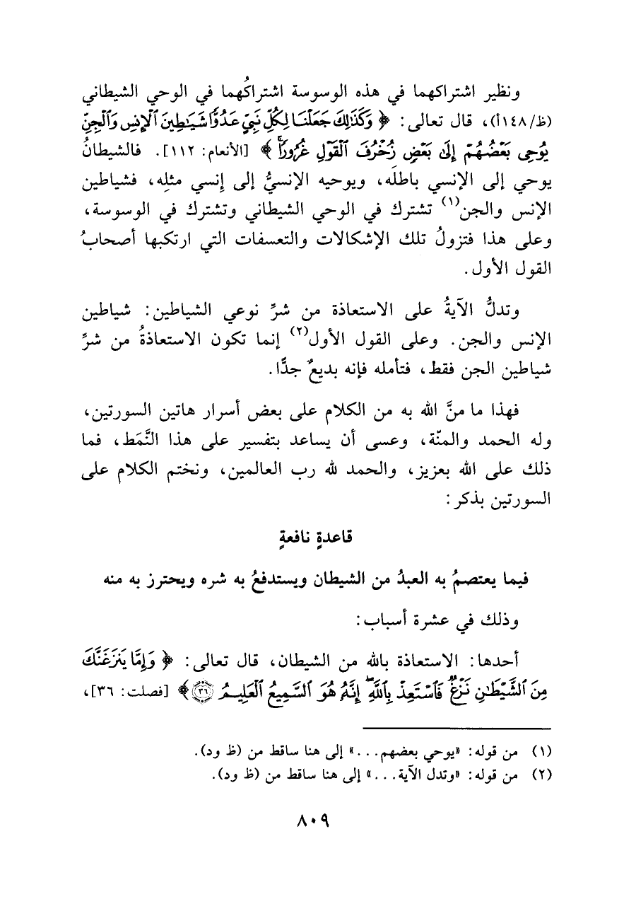 وتدلُّ الآيةُ على الاستعاذة من شرِّ نوعي الشياطين: شياطين الإنس والجن. وعلى القول الأول (¬٢) إنما تكون الاستعاذةُ من شرِّ شياطين الجن فقط، فتأمله فإنه بديعٌ جدًّا.