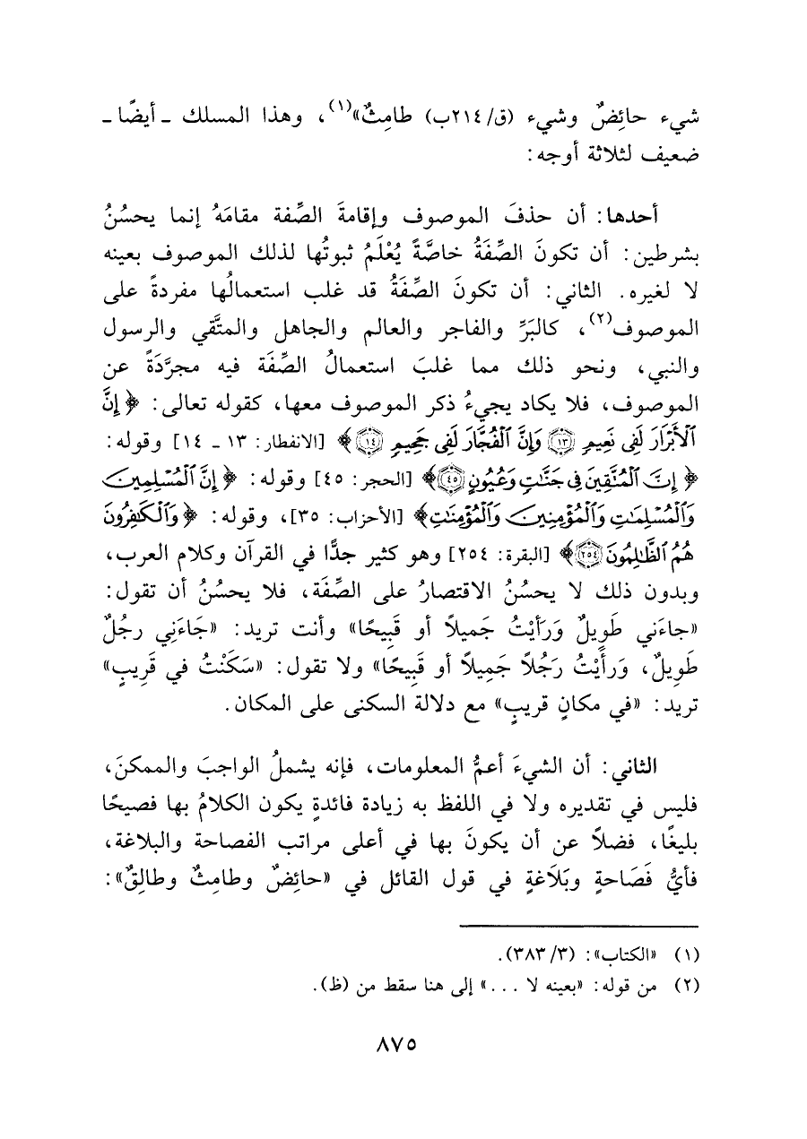 الثاني: أن الشيءَ أعمُّ المعلومات، فإنه يشملُ الواجب والممكنَ، فليس في تقديره ولا في اللفظ به زيادة فائدة يكون الكلامُ بها فصيحًا بليغًا، فضلًا عن أن يكونَ بها في أعلى مراتب الفصاحة والبلاغة، فأيُّ فَصَاحةٍ وبَلَاغةٍ في قول القائل في "حائِضٌ وطامِثٌ وطالِقٌ":