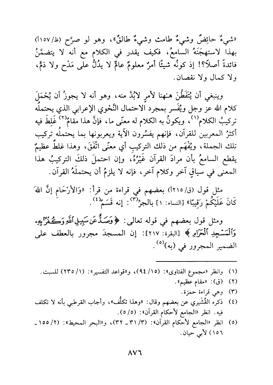 ومثل قول بعضهم في قوله تعالى: {وَصَدٌّ عَنْ سَبِيلِ اللَّهِ وَكُفْرٌ بِهِ وَالْمَسْجِدِ الْحَرَامِ} [البقرة: ٢١٧]: إن المسجدَ مجرور بالعطف على الضمير المجرور في (به) (¬٥).