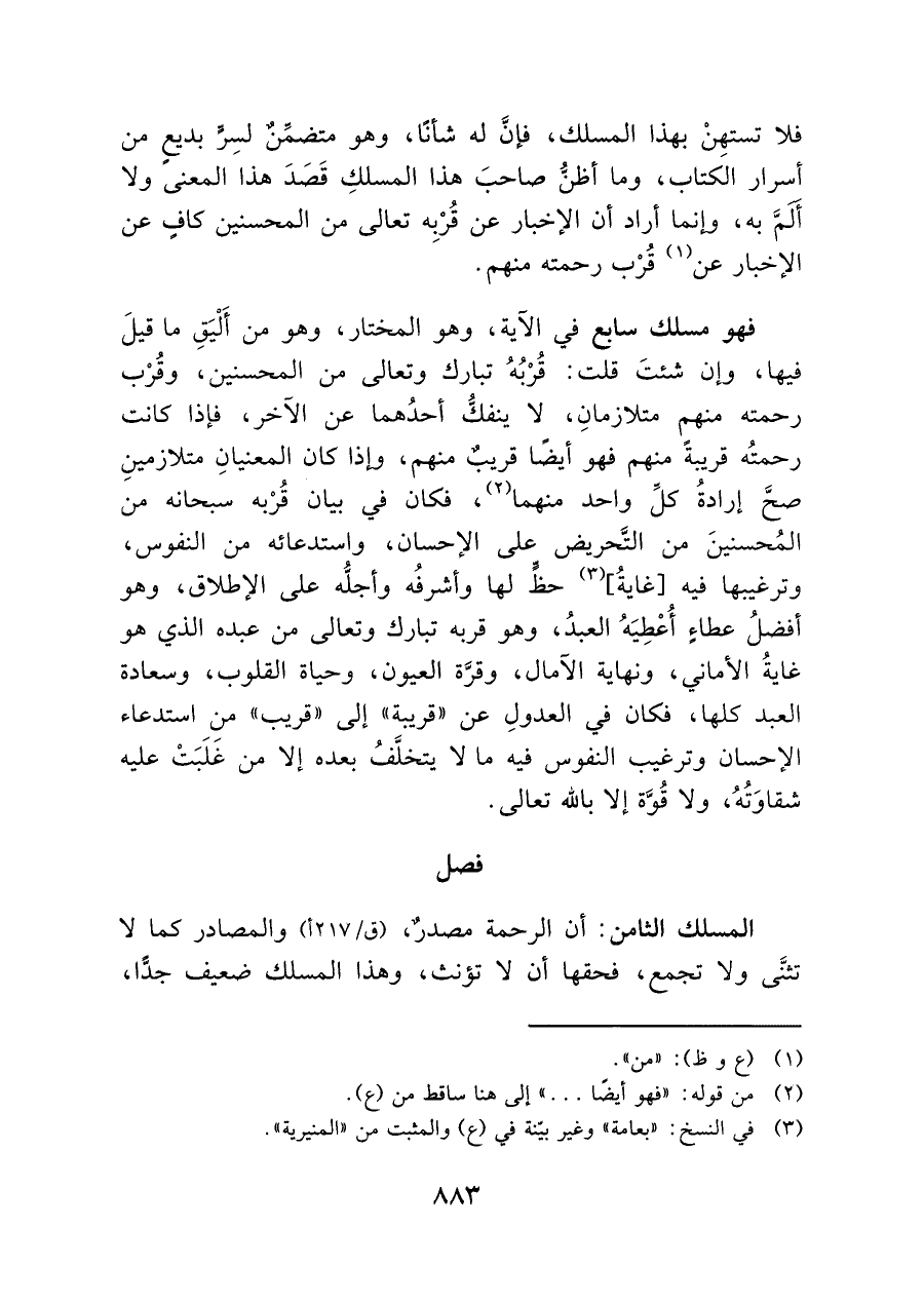 فهو مسلك سابع في الآية، وهو المختار، وهو من أَلْيَقِ ما قيلَ فيها، وإن شئتَ قلت: فُرْبُهُ تبارك وتعالى من المحسنين، وقُرْب رحمته منهم متلازمانِ، لا ينفكُّ أحدُهما عن الآخر، فإذا كانت رحمتُه قريبةً منهم فهو أيضًا قريبٌ منهم، وإذا كان المعنيانِ متلازمينِ صحَّ إرادةُ كلِّ واحد منهما (¬٢)، فكان في بيان قُرْبه سبحانه من المُحسنينَ من التَّحريض على الإحسان، واستدعائه من النفوس، وترغيبها فيه [غايةُ] (¬٣) حظٍّ لها وأشرفُه وأجلُّه على الإطلاق، وهو أفضلُ عطاءٍ أُعْطِيَهُ العبدُ، وهو قربه تبارك وتعالى من عبده الذي هو غايةُ الأماني، ونهاية الآمال، وقرَّة العيون، وحياة القلوب، وسعادة العبد كلها، فكان في العدولِ عن "قريبة" إلى "قريب" من استدعاء الإحسان وترغيب النفوس فيه ما لا يتخلَّفُ بعده إلا من غَلَبَتْ عليه شقاوَتُهُ، ولا قُوَّة إلا بالله تعالى.