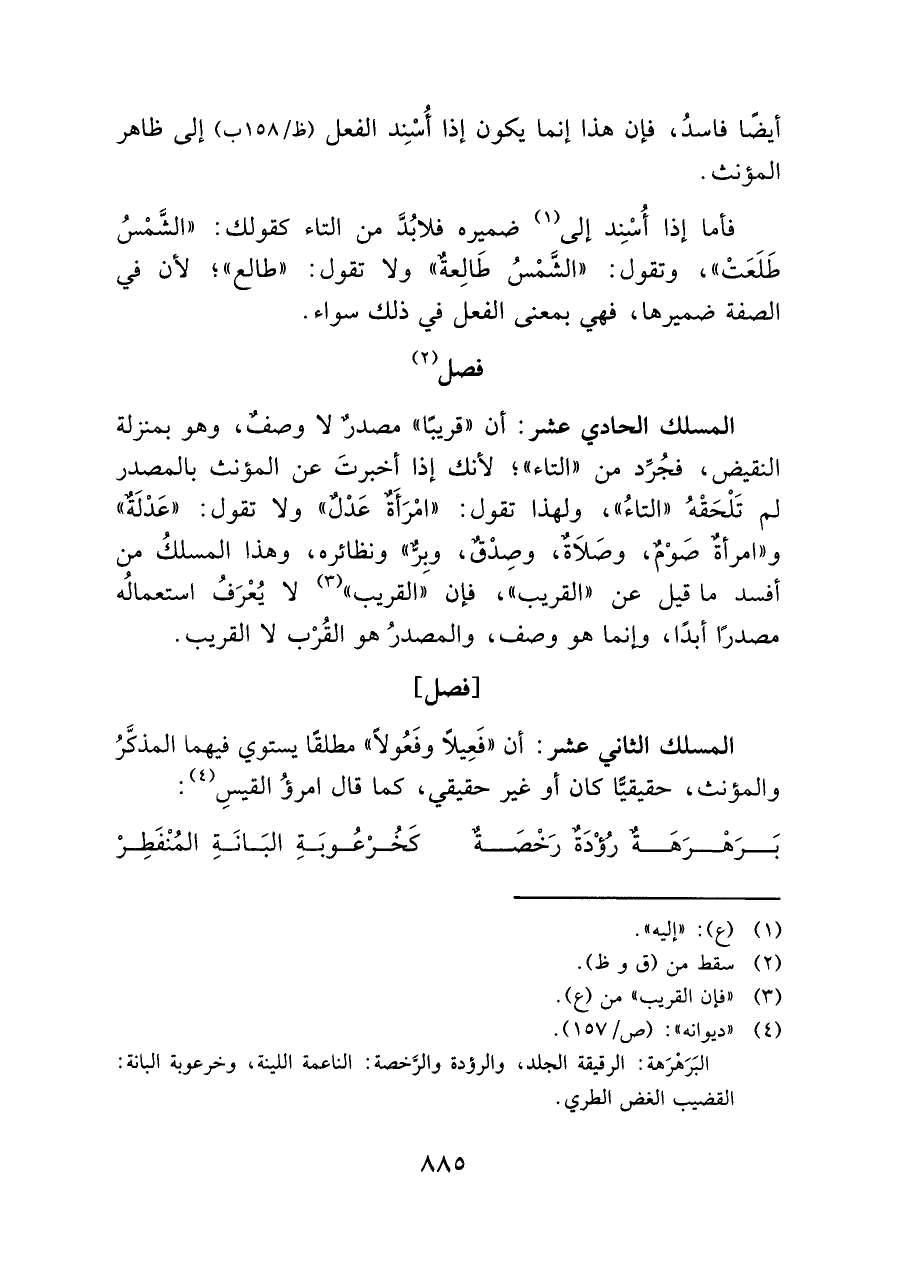 المسلك الثاني عشر: أن "فَعِيلًا وفَعُولًا" مطلقًا يستوي فيهما المذكَّرُ والمؤنث، حقيقيًّا كان أو غير حقيقي، كما قال امرؤُ القيسِ (¬٤):