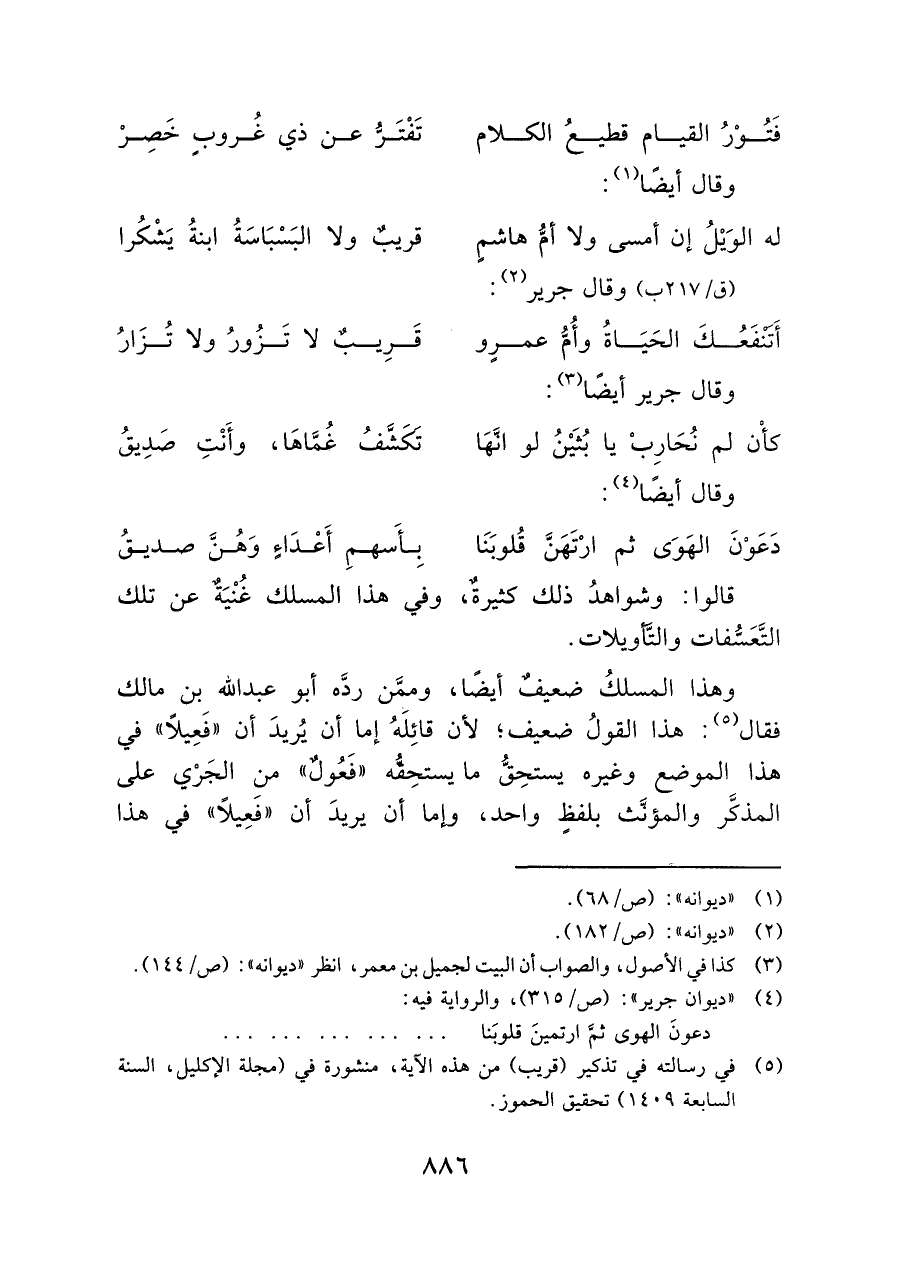 وهذا المسلكُ ضعيفٌ أيضًا، وممَّن ردَّه أبو عبد الله بن مالك فقال (¬٥): هذا القولُ ضعيف؛ لأن قائِلَهُ إما أن يُريدَ أن "فَعِيلًا" في هذا الموضع وغيره يستحِقُّ ما يستحِقُّه "فَعُولٌ" من الجَرْي على المذكَّر والمؤنَّث بلفظٍ واحد، وإما أن يريدَ أن "فَعِيلًا" في هذا