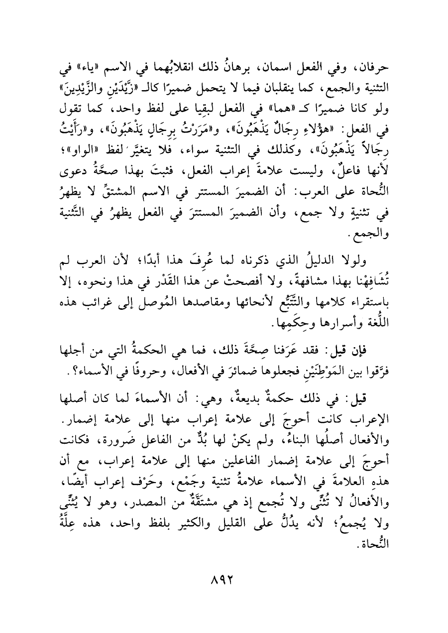 حرفان، وفي الفعل اسمان، برهانُ ذلكْ انقلابُهما في الاسم "ياء" في التثنية والجمع، كما ينقلبان فيما لا يتحمل ضميرًا كالـ "زَّيْدَيْنِ والزَّيْدِينَ" ولو كانا ضميرًا كـ "هما" في الفعل لبقِيا على لفظ واحد، كما تقول في الفعل: "هؤُلاءِ رِجَالٌ يَذْهَبُونَ"، و"مَرَرْتُ بِرِجَالٍ يَذْهَبُون"، و"رَأَيْتُ رِجَالًا يَذْهَبُونَ"، وكذلك في التثنية سواء، فلا يتغيَّر لفظ "الواو"؛ لأنها فاعلٌ، وليست علامةَ إعراب الفعل، فثبتَ بهذا صحَّةُ دعوى النُّحاة على العرب: أن الضميرَ المستتر في الاسم المشتقِّ لا يظهرُ في تثنيةٍ ولا جمع، وأن الضميرَ المستترَ في الفعل يظهرُ في التَّثنية والجمع.