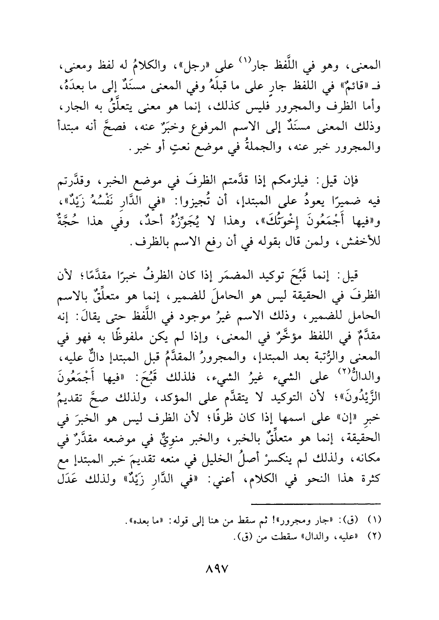 قيل: إنما قَبُحَ توكيد المضمَر إذا كان الظرفُ خبرًا مقدَّمًا؛ لأن الظرفَ في الحقيقة ليس هو الحاملَ للضمير، إنما هو متعلِّقٌ بالاسم الحامل للضمير، وذلك الاسم غيرُ موجود في اللَّفظ حتى يقالَ: إنه مقدَّمٌ في اللفظ مؤخَّرٌ في المعنى، وإذا لم يكن ملفوظًا به فهو في المعنى والرُّتبة بعد المبتدإ، والمجرورُ المقدَّمُ قبل المبتدإ دالٌّ عليه، والدالُّ (¬٢) على الشيء غيرُ الشيء، فلذلك قَبُحَ: "فيها أجْمَعُونَ الزَّيْدُونَ" (١)؛ لأن التوكيد لا يتقدَّم على المؤكد، ولذلك صحَّ تقديمُ خبرِ "إن" على اسمها إذا كان ظرفُا، لأن الظرف ليس هو الخيرَ في الحقيقة، إنما هو متعلِّقٌ بالخبر، والخبر منوِيٌّ في موضعه مقدَّرٌ في مكانه؛ ولذلك لم ينكسرْ أصلُ الخليل في منعه تقديمَ خبر المبتدإ مع كثرة هذا النحو في الكلام، أعني: "في الدَّارِ زَيْدٌ" ولذلك عَدَل
