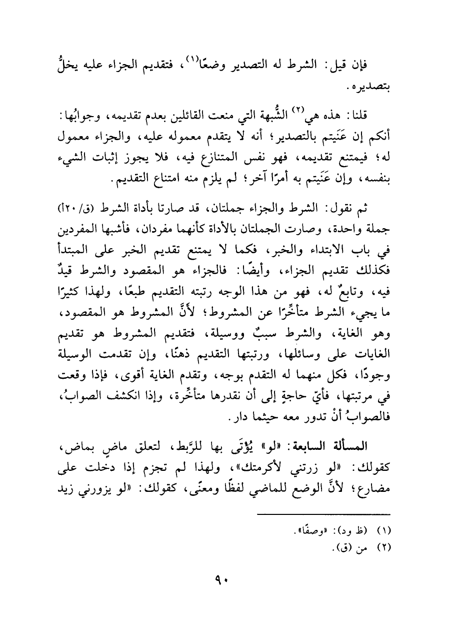 قلنا: هذه هي (¬٢) الشُّبهة التي منعت القائلين بعدم تقديمه، وجوابُها: أنكم إن عَنيتم بالتصدير؛ أنه لا يتقدم معموله عليه، والجزاء معمول له؛ فيمتنع تقديمه، فهو نفس المتنازع فيه، فلا يجوز إثبات الشيء بنفسه، وإن عَنيتم به أمرًا آخر؛ لم يلزم منه امتناع التقديم.