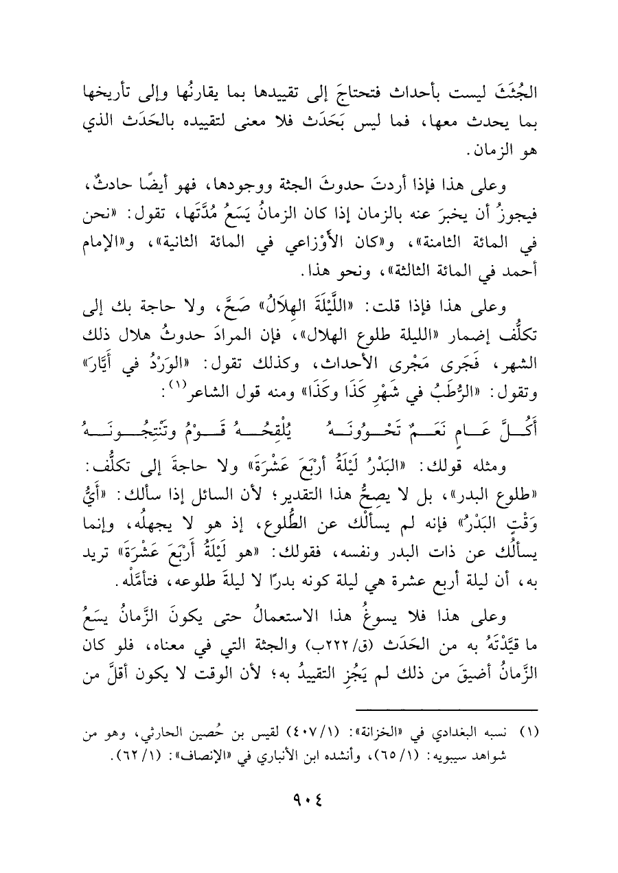 وعلى هذا فإذا أردتَ حدوثَ الجثة ووجودها، فهو أيضًا حادثٌ، فيجوزُ أن يخبرَ عنه بالزمان إذا كان الزمانُ يَسَعُ مُدَّتَها، تقول: "نحن في المائة الثامنة"، و"كان الأَوْزاعي في المائة الثانية"، و"الإمام أحمد في المائة الثالثة"، ونحو هذا.