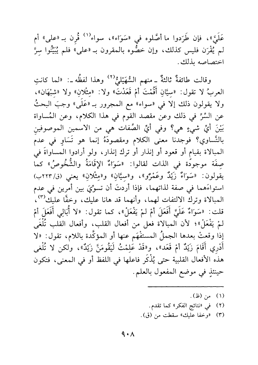 عَلَيَّ" فإن طَرَدوا ما أصَّلوه في "سَوَاء"، سواء (¬١) قُرِن بـ "على" أم لم يُقْرَن فليس كذلك، وإن خصُّوه بالمقرون بـ "على" فلم يُبَيِّنُوا سِرَّ اختصاصه بذلك.