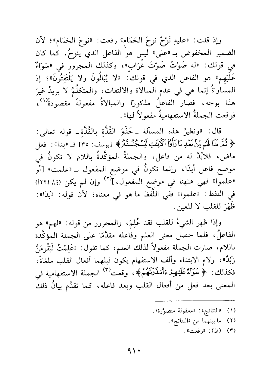 وإذ قلت: "عليهِ نَوْحٌ نوحَ الحَمَامِ" رفعت: "نوحَ الحَمَام"؛ لأن الضمير المخفوض بـ "على" ليس هو الفاعل الذي ينوحُ، كما كان في قولك: "له صَوْتٌ صَوْتَ غُرَابٍ"، وكذلك المجرور في "سَوَاءٌ عَلَيْهِم" هو الفاعل الذي في قولك: "لا يُبَالُون ولا يَلْتَفِتُونَ"، إذ المساواةُ إنما هي في عدم المبالاة والالتفات، والمتكلِّمُ لا يريدُ غيرَ هذا بوجه، فصار الفاعلُ مذكورًا والمبالاةُ مفعولةً مقصودةً (¬١)، فوقعت الجملةُ الاستفهاميةُ مفعولًا لها".