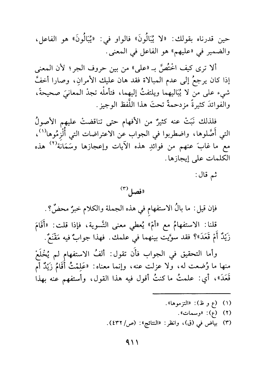 وأما التحقيق في الجواب فأَن تقول: ألفُ الاستفهام لم يُخْلَعْ منها ما وُضعت له، ولا عزلت عنه، وإنما معناه: "عَلِمْتُ أقَامُ زَيْدٌ أم قَعَدَ"، أي: علمتُ ما كنتُ أقول فيه هذا القول، وأستفهم عنه بهذا