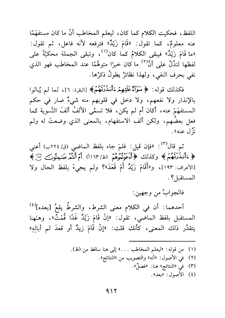 ثم قال (¬٣) "فإن قيل: فلمَ جاء بلفظ الماضي (ق/٢٢٤ ب) أعني {أَأَنْذَرْتَهُمْ} وكذلك {أَدَعَوْتُمُوهُمْ أَمْ أَنْتُمْ صَامِتُونَ (١٩٣)} [الأعراف: ١٩٣]، و"أَقَامَ زَيْدٌ أَمْ قَعَدَ"؟ ولم يجيءْ بلفظ الحال ولا المستقبل؟.