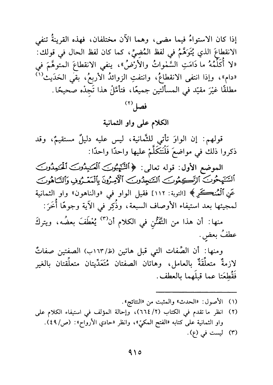 (¬٢) انظر ما تقدم في الكتاب (٢/ ٦٦٤)، وإحالة المؤلف في استيفاء الكلام على واو الثمانية على كتابه "الفتح المكيّ"، وانظر "حادي الأرواح": (ص/ ٤٩).
