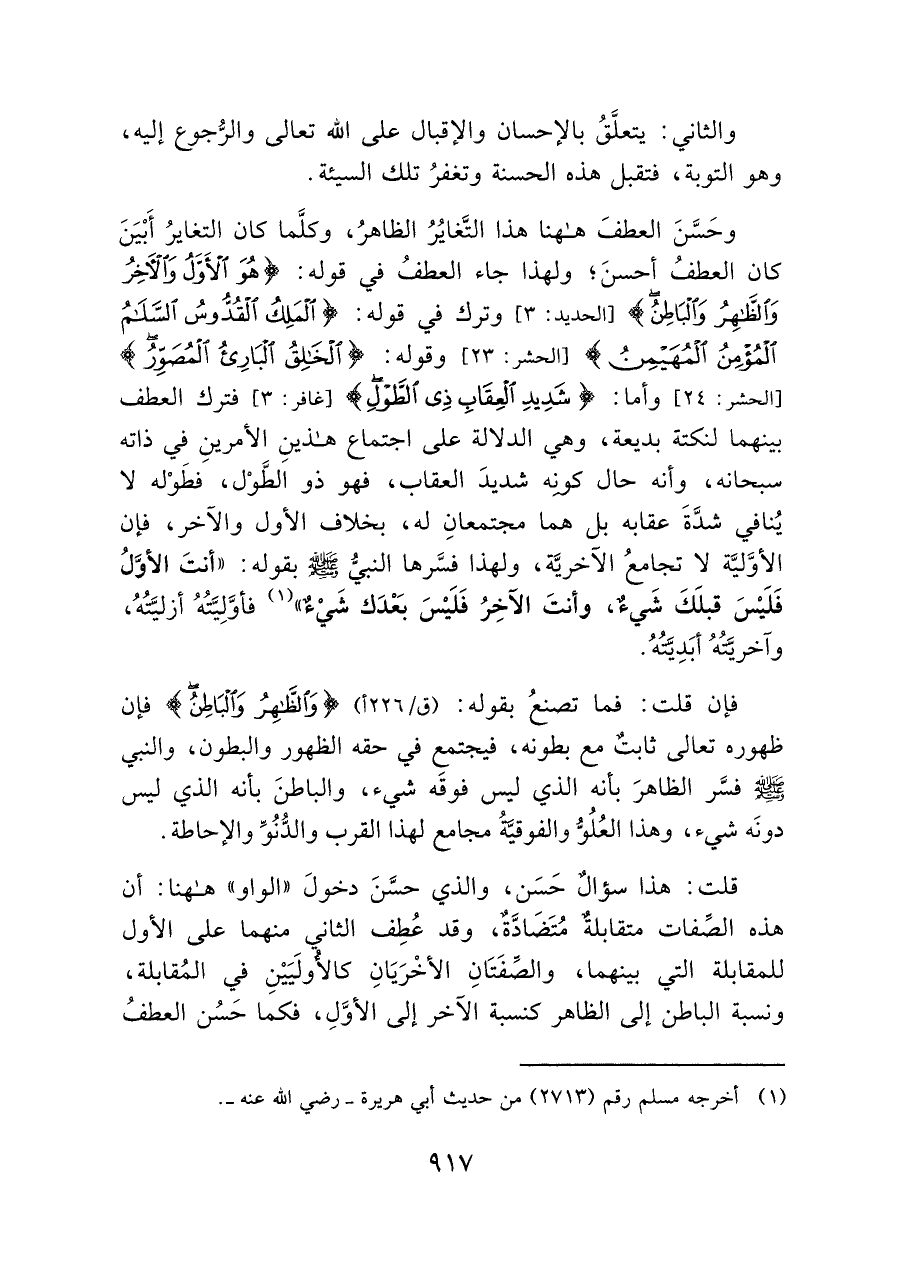 وحَسَّنَ العطفَ هاهنا هذا التَّغايُرُ الظاهرُ، وكلَّما كان التغايرُ أَبْيَنَ كان العطفُ أحسنَ؛ ولهذا جاء العطفُ في قوله: {هُوَ الْأَوَّلُ وَالْآخِرُ وَالظَّاهِرُ وَالْبَاطِنُ} [الحديد: ٣] وترك في وقوله: {الْمَلِكُ الْقُدُّوسُ السَّلَامُ الْمُؤْمِنُ الْمُهَيْمِنُ} [الحشر ٢٣] وقوله: {الْخَالِقُ الْبَارِئُ الْمُصَوِّرُ} [الحشر: ٢٤] وأما: {شَدِيدِ الْعِقَابِ ذِي الطَّوْلِ} [غافر: ٣] فترك العطف بينهما لنكتة بديعة، وهي الدلالة على اجتماع هذينِ الأمرينِ في ذاته سبحانه، وأنه حال كونِه شديدَ العقاب، فهو ذو الطَّوْل، فطَوْله لا يُنافي شدَّةَ عقابه بل هما مجتمعانِ له، بخلاف الأول والآخر، فإن الأوَّليَّة لا تجامعُ الآخريَّة، ولهذا فسَّرها النبيُّ - صلى الله عليه وسلم - بقوله: "أنتَ الأوَّلُ فَلَيْسَ قبلَكَ شَيءٌ، وأنتَ الآخِرُ فَلَيْسَ بَعْدَك شَيْءٌ" (¬١) فأوَّلِيَّتُهُ أزليَّتُهُ، وآخريَّتُهُ أبَدِيَّتُهُ.