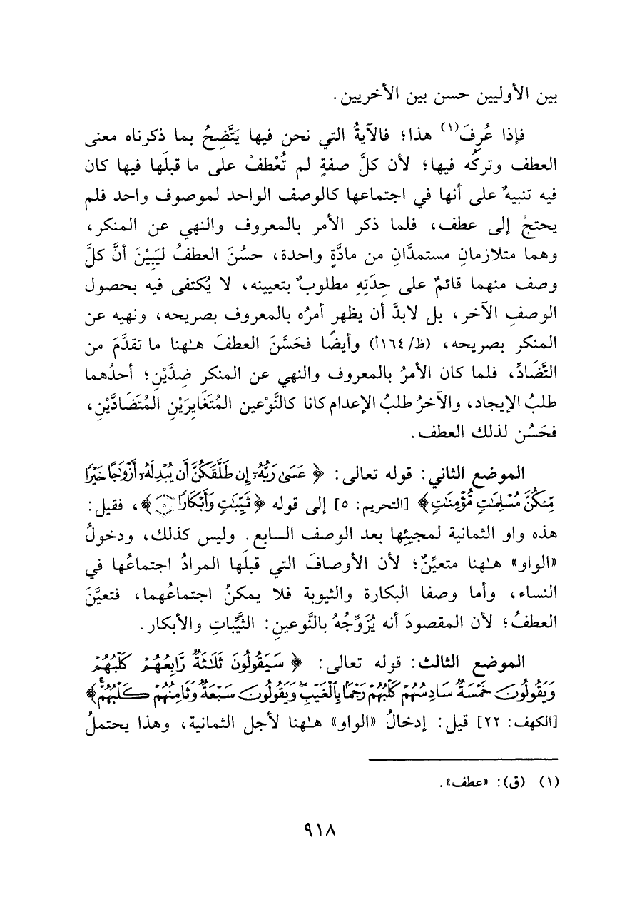 الموضع الثاني: قوله تعالى: {عَسَى رَبُّهُ إِنْ طَلَّقَكُنَّ أَنْ يُبْدِلَهُ أَزْوَاجًا خَيْرًا مِنْكُنَّ مُسْلِمَاتٍ مُؤْمِنَاتٍ} [التحريم: ٥]، إلى قوله {ثَيِّبَاتٍ وَأَبْكَارًا}، فقيل: هذه واو الثمانية لمجيئِها بعد الوصف السابع. وليس كذلك، ودخولُ "الواو" هاهنا متعيِّنٌ؛ لأن الأوصاف التي قبلَها المرادُ اجتماعُها في النساء، وأما وصفا البكارة والثيوبة فلا يمكنُ اجتماعُهما، فتعيَّنَ العطف؛ لأن المقصودَ أنه يُزَوِّجُهُ بالنَّوعينِ: الثَّيِّباتِ والأبكار.