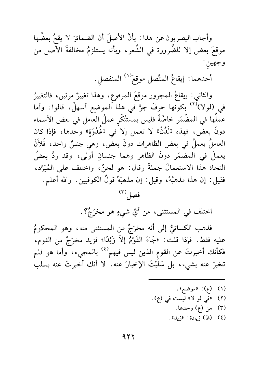 وأجاب البصريون عن هذا: بأنَّ الأصلَ أن الضمائرَ لا يقعُ بعضُها موقعَ بعض ألا للضَّرورة في الشِّعر، وبأنه يستلزمُ مخالفةَ الأصل من وجهينِ: