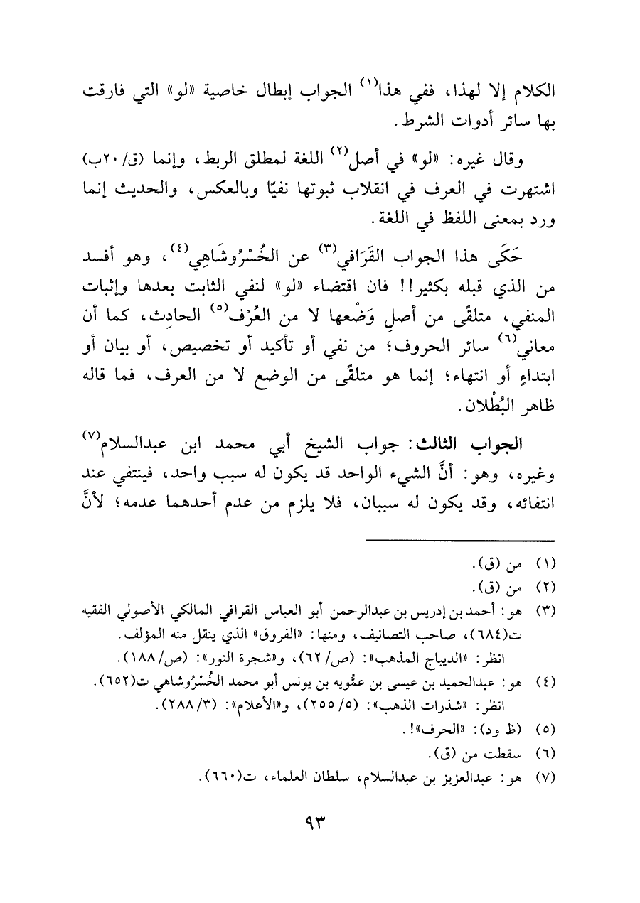 (¬٣) هو: أحمد بن إدريس بن عبد الرحمن أبو العباس القرافي المالكي الأصولي الفقيه ت (٦٨٤) , صاحب التصانيف، ومنها: "الفروق" الذي ينقل منه المؤلف.