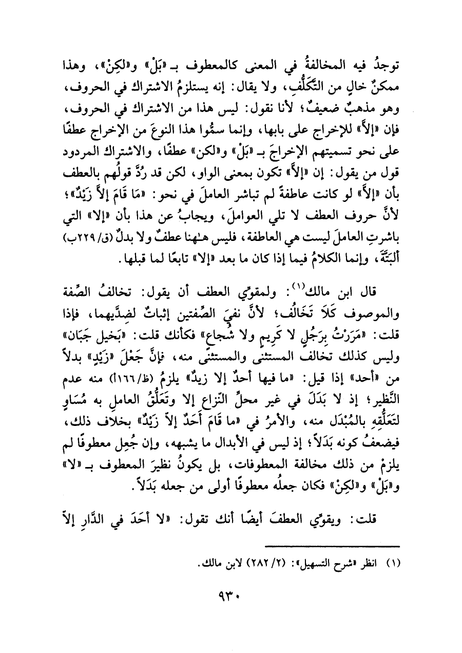 قال ابن مالك (¬١): ولمقوِّى العطف أن يقول: تخالفُ الصِّفة والموصوف كَلا تَخَالُف، لأنَّ نفي الصِّفتين إثباتٌ لضِدَّيهما، فإذا قلت: "مرَرْتُ بِرَجُلٍ لا كرِيم ولا شجاع" فكأنك قلت: "بَخيل جَبَان" وليس كذلك تخالف المستثنى والمستثنى منه، فإنَّ جَعْلَ "زيْدٍ" بدلاً من "أحد" إذا قيل: "ما فيها أحدٌ إلا زيدٌ" يلزمُ منه عدم النَّظير، إذ لا بَدَلَ في غير محل النّزاع إلا وتَعَلُّقُ العاملِ به مُسَاوٍ لتَعَلُّقِهِ بالمبْدَل منه, والأمرُ في "ما قَامَ أَحَدٌ إلاّ زَيْدٌ" بخلاف ذلك، فيضعفُ كونه بَدَلاً، إذ ليس في الأبدال ما يشبهه، وإن جُعِل معطوفًا لم يلزمْ من ذلك مخالفة المعطوفات، بل يكون نظيرَ المعطوف بـ"لا" و"بَلْ " و"لكِنْ " فكان جعلُه معطوفًا أولى من جعله بَدَلاً.