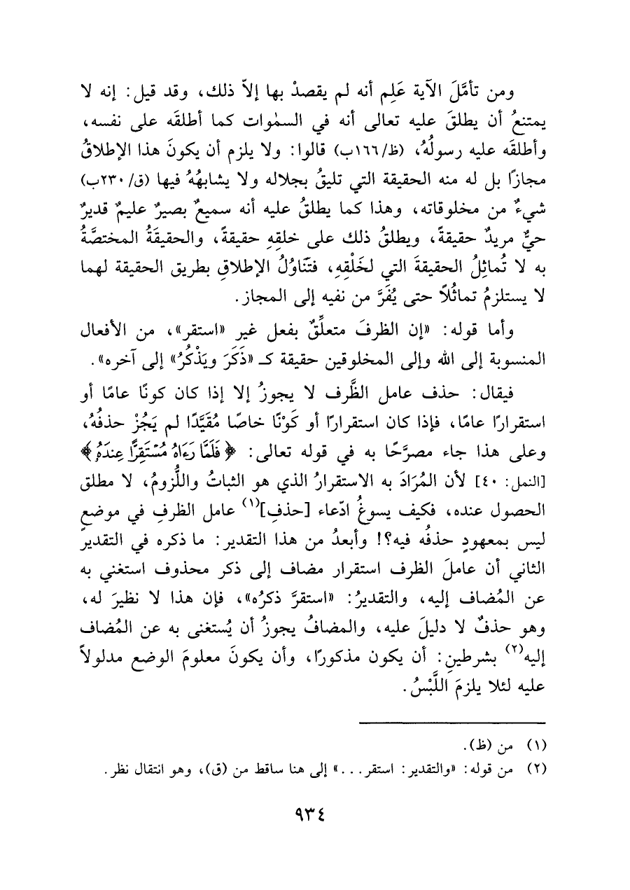 وأما قوله: "إن الظرفَ متعلّقٌ بفعل غير "استقر"، من الأفعال المنسوبة إلى الله وإلى المخلوقين حقيقة كـ "ذَكَرَ ويَذْكُرُ" إلى آخره".