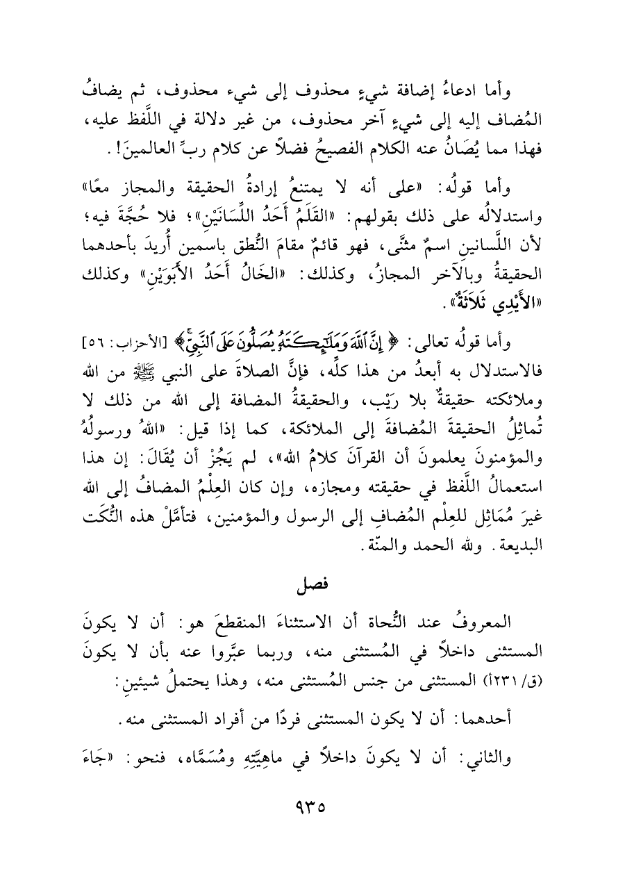 وأما قوله تعالى: {إِنَّ اللَّهَ وَمَلَائِكَتَهُ يُصَلُّونَ عَلَى النَّبِيِّ} [الأحزاب: ٥٦] فالاستدلال به أبعدُ من هذا كلِّه، فإنَّ الصلاةَ على النبى - صلى الله عليه وسلم - من الله وملائكته حقيقةٌ بلا رَيْب، والحقيقةُ المضافة إلى الله من ذلك لا تُماثِلُ الحقيقةَ المُضافةَ إلى الملائكة، كما إذا قيل: "الله ورسولُهُ والمؤمنونَ يعلمونَ أن القرآنَ كلامُ الله "، لم يَجُزْ أن يُقَالَ: إن هذا استعمالُ اللَّفظ في حقيقته ومجازه، وإن كان العِلْمُ المضافُ إلى الله غيرَ مماثِل للعِلْم المُضافِ إلى الرسول والمؤمنين، فتأمَّلْ هذه النُّكَت البديعة. ولله الحمد والمنّة.