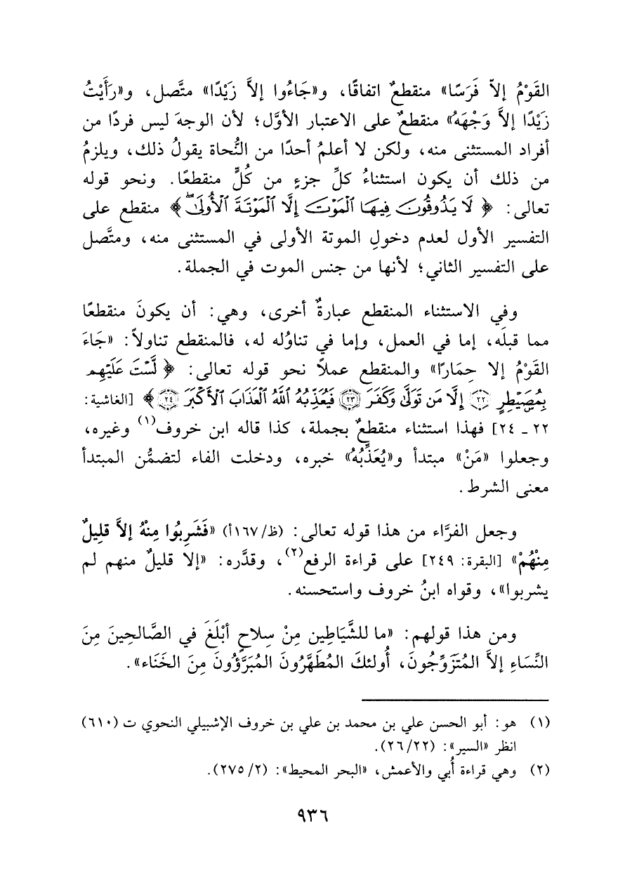 وجعل الفرَّاء من هذا قوله تعالى: {فَشَرِبُوا مِنْهُ إِلَّا قَلِيلٌ مِنْهُمْ} [البقرة: ٢٤٩] على قراءة الرَّفع (¬٢)، وقدَّره: "إلا قليلٌ منهم لم يشربوا"، وقواه ابن خروف واستحسنه.