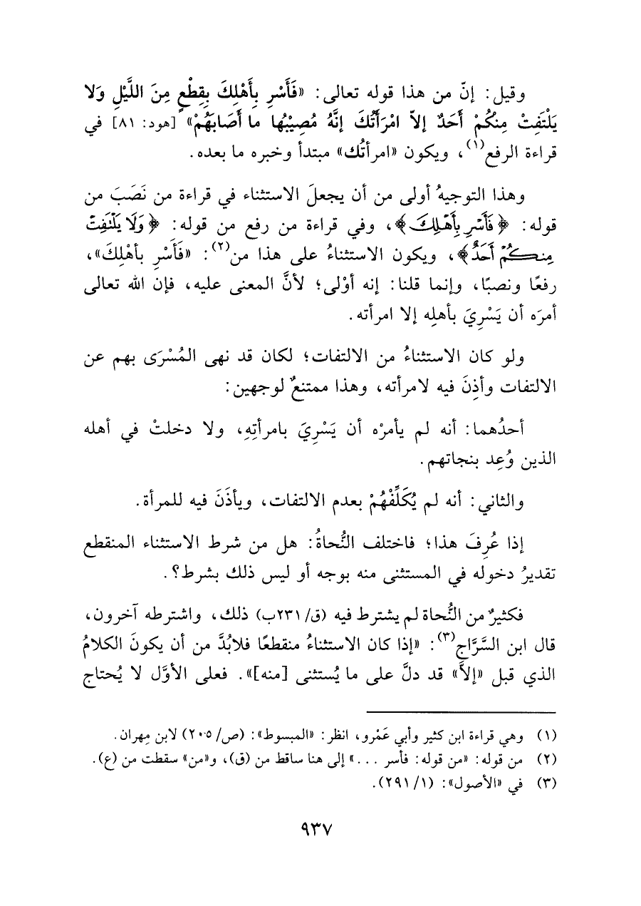 وهذا التوجيهُ أولى من أن يجعلَ الاستثناء في قراءة من نَصَبَ من قوله: {فَأَسْرِ بِأَهْلِكَ}، وفي قراءة من رفع من قوله: {وَلَا يَلْتَفِتْ مِنْكُمْ أَحَدٌ} , ويكون الاستثناءُ على هذا من (¬٢): "فَأَسرِ بأهْلِكَ "، رفعًا ونصبًا، وإنما قلنا: إنه أوْلى؛ لأنَّ المعنى عليه، فإن الله تعالى أمرَه أن يَسْرِيَ بأهلِه إلا امرأته.