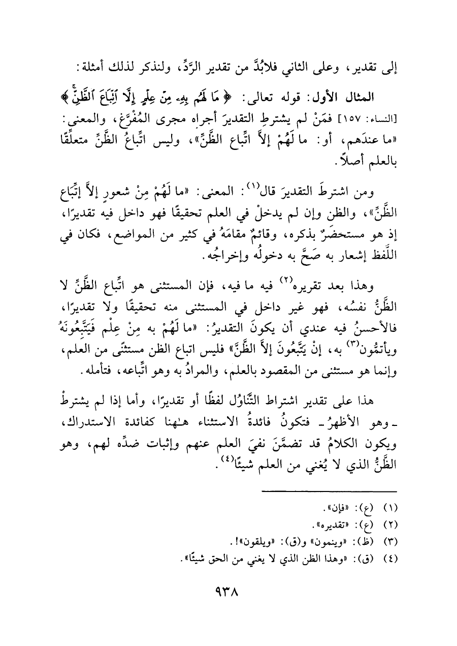 وهذا بعد تقريره (¬٢) فيه ما فيه، فإن المستثنى هو اتِّباع الظَّنِّ لا الظَّنُّ نفسُه، فهو غير داخل في المستثنى منه تحقيقًا ولا تقديرًا، فالأحسن فيه عندي أن يكونَ التقديرُ: "ما لَهمْ به مِنْ عِلْم فَيَتَّبعُونَهُ ويأتمُّون (¬٣) به، إن يتَّبعُونَ إلَاّ الظَّنَّ" فليس اتباع الظن مستثنى من العلم، وإنما هو مستثنى من المقصود بالعلم، والمراد به وهو اتِّباعه، فتأمله.