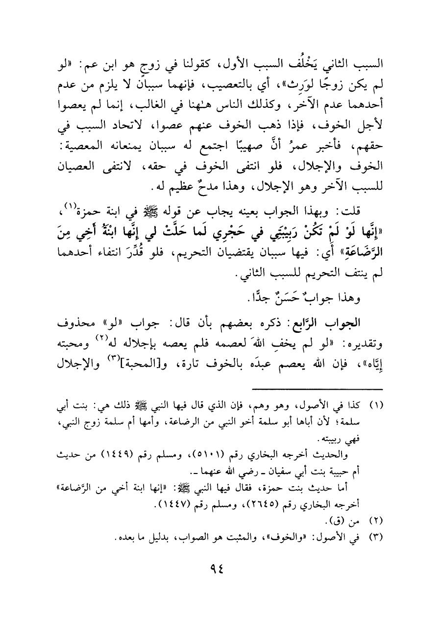 الجواب الرَّابع: ذكره بعضهم بأن قال: جواب "لو" محذوف وتقديره: "لو لم يخف الله لعصمه فلم يعصه بإجلاله له (¬٢) ومحبته إِيَّاه"، فإن الله يعصم: عبدَه بالخوف تارة، و [المحبة] (¬٣) والإجلال