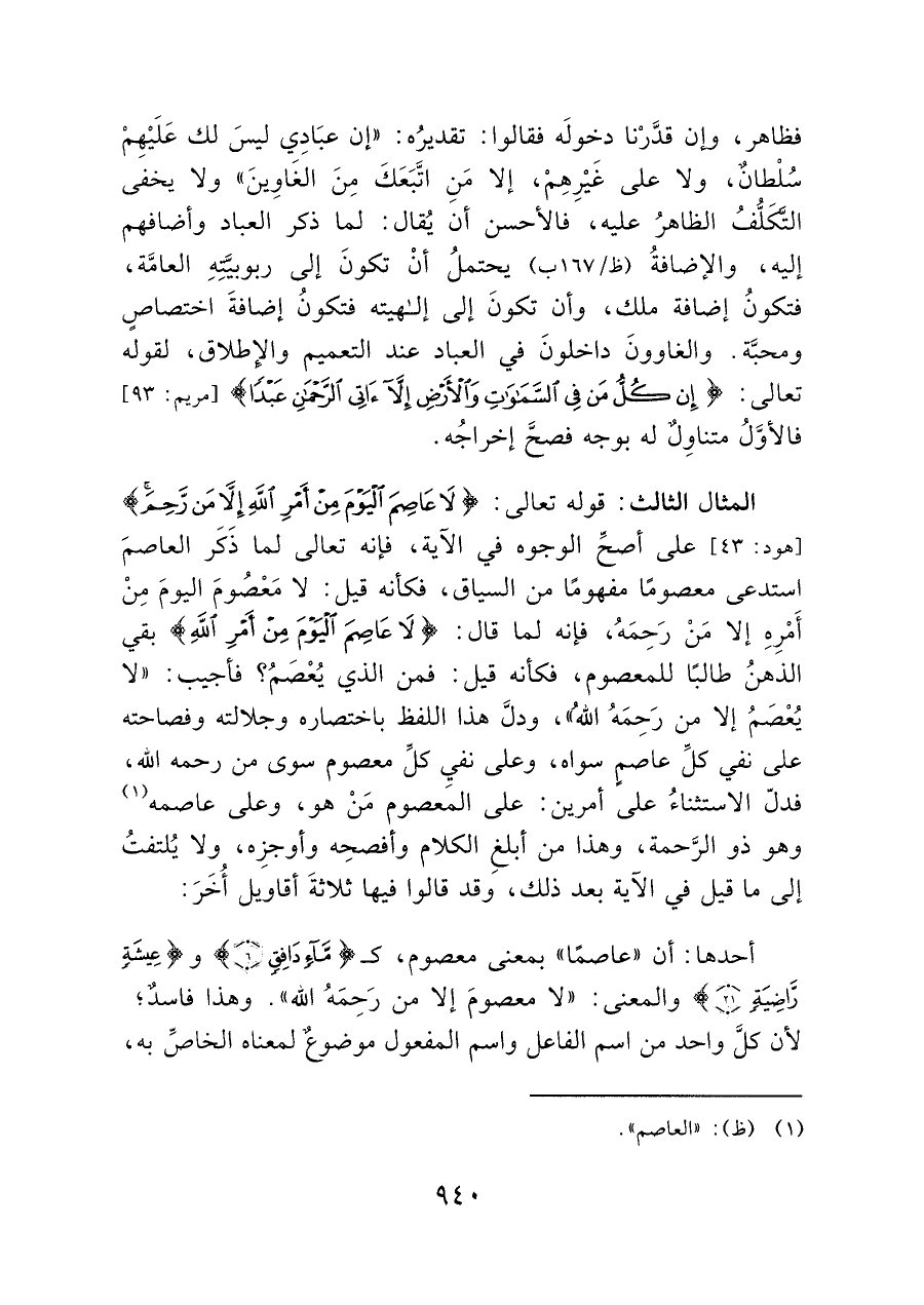 المثال الثالث: قوله تعالى: {لَا عَاصِمَ الْيَوْمَ مِنْ أَمْرِ اللَّهِ إِلَّا مَنْ رَحِمَ} [هود: ٤٣] على أصحِّ الوجوه في الآية، فإنه تعالى لما ذَكَر العاصمَ استدعى معصومًا مفهومًا من السياق، فكأنه قيل: لا مَعْصُومَ اليومَ مِن أَمْرِهِ إلا مَنْ رَحِمَهُ، فإنه لما قال: {لَا عَاصِمَ الْيَوْمَ مِنْ أَمْرِ اللَّهِ} بقي الذهنُ طالبًا للمعصوم، فكأنه قيل: فمن الذي يُعصَمُ؛ فأجيب: "لا يُعصمُ إلا من رَحَمَهُ اللهُ"، ودلَّ هذا اللفظ باختصاره وجلالته وفصاحته على نفي كلِّ عاصمٍ سواه، وعلى نفي كلِّ معصوم سوى من رحمه الله، فدلّ الاستثناءُ على أمرين: على المَعصوم مَن هو، وعلى عاصمه (¬١) وهو ذو الرَّحمة، وهذا من أبلغِ الكلام وأفصحِه وأوجزِه، ولا يُلتفتُ إلى ما قيل فى الآية بعد ذلك، وقد قالوا فيها ثلاثةَ أقاويل أُخَر: