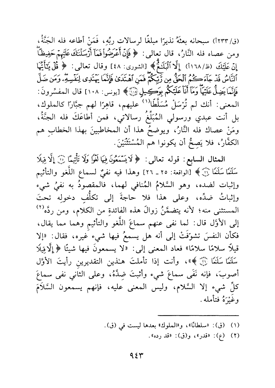 سبحانه بعثَهُ نذيرًا مبلغًا لرسالات ربِّهِ، فَمَنْ أطاعه فله الجَنَّة، ومن عصاه فله النَّارُ، قال تعالى: {فَإِنْ أَعْرَضُوا فَمَا أَرْسَلْنَاكَ عَلَيْهِمْ حَفِيظًا إِنْ عَلَيْكَ إِلَّا الْبَلَاغُ} [الشورى: ٤٨] وقال تعالى: {قُلْ يَاأَيُّهَا النَّاسُ قَدْ جَاءَكُمُ الْحَقُّ مِنْ رَبِّكُمْ فَمَنِ اهْتَدَى فَإِنَّمَا يَهْتَدِي لِنَفْسِهِ وَمَنْ ضَلَّ فَإِنَّمَا يَضِلُّ عَلَيْهَا وَمَا أَنَا عَلَيْكُمْ بِوَكِيلٍ (١٠٨)} [يونس: ١٠٨] قال المفسِّرونَ: المعنى: أنك لم تُرْسَلْ مُسَلَّطًا (¬١) عليهم، قاهِرًا لهم جبَّارًا كالملوك، بل أنت عبدي ورسولي المُبِّلِّغُ رسالاتي، فمن أطاعَكَ فله الجنَّةُ، ومَنْ عصاك فله النَّارُ، ويوضحُ هذا أن المخاطبينَ بهذا الخطاب هم الكفَّارُ، فلا يَصِحُّ أن يكونوا هم المُسْتَثنيْنَ.